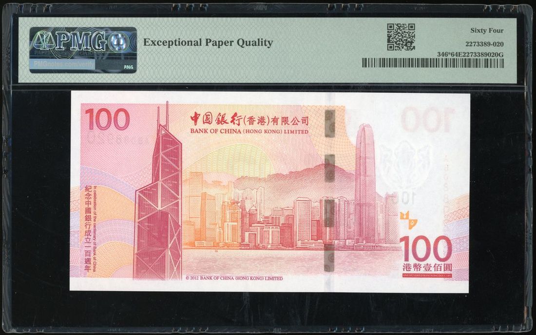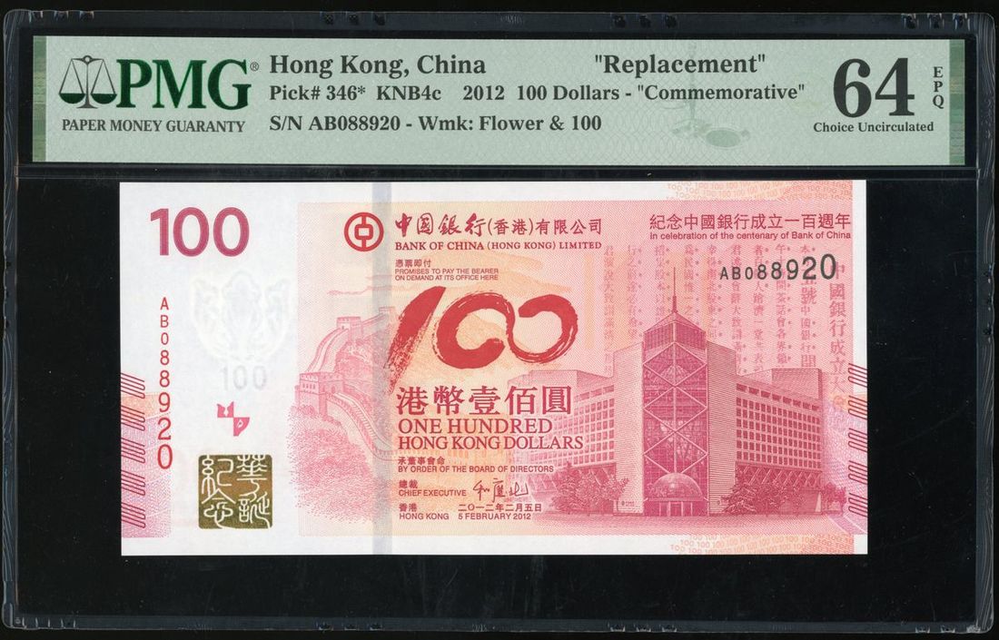 Bank of China (Hong Kong), $100, replacement, 5.2.2012, commemorative of the centenary of the bank, serial number AB088920, (Pick 346*), PMG 64EPQ Choice Uncirculated.