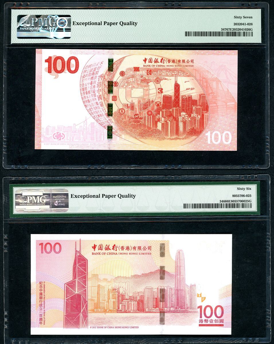 Bank of China (Hong Kong) Limited, a pair of $100, 2012 and 2017, 100th anniversary of the bank in Hong Kong and 'Commemorative' issue for the centenary of the Bank of China, the former with fancy serial number HY440055 and the latter 256868, (Pick 347 and 346), semi fancy numbers pair, graded PMG 67EPQ and 66EPQ respectively (2).