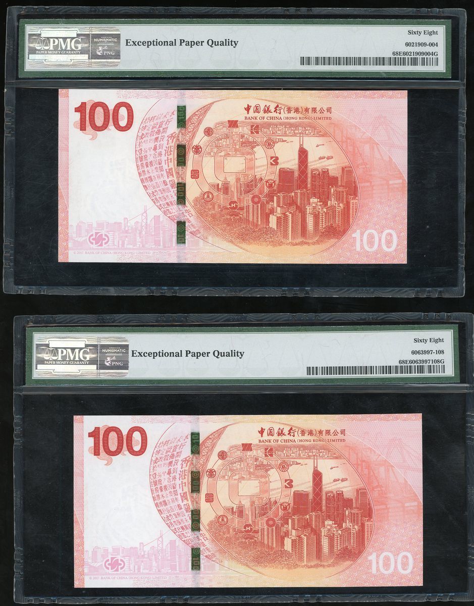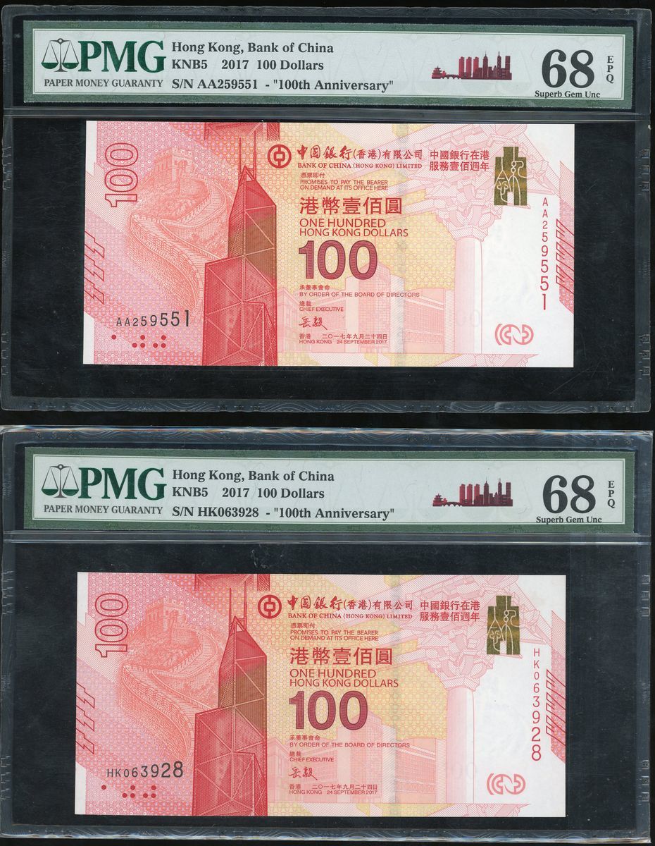 Bank of China, a pair of $100, 2017, 100th Anniversary Commemorative issue, serial number AA259551 and HK063928, (Pick 347), both graded PMG 68EPQ.(2)