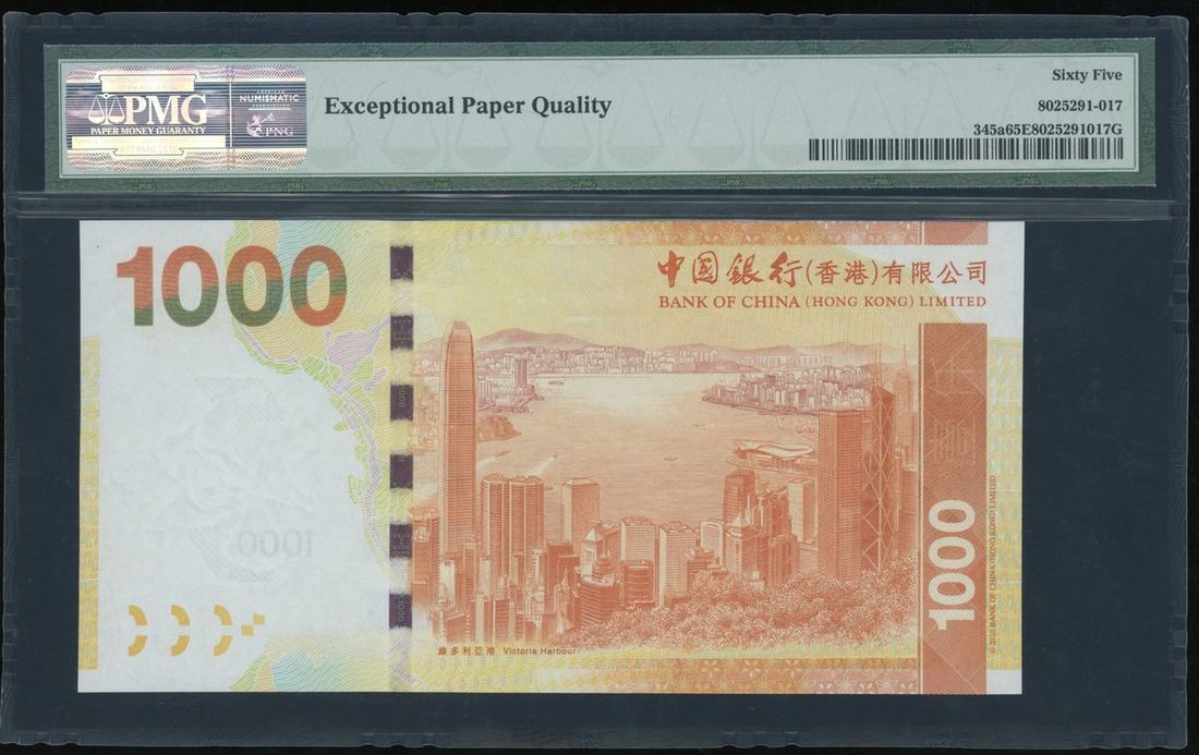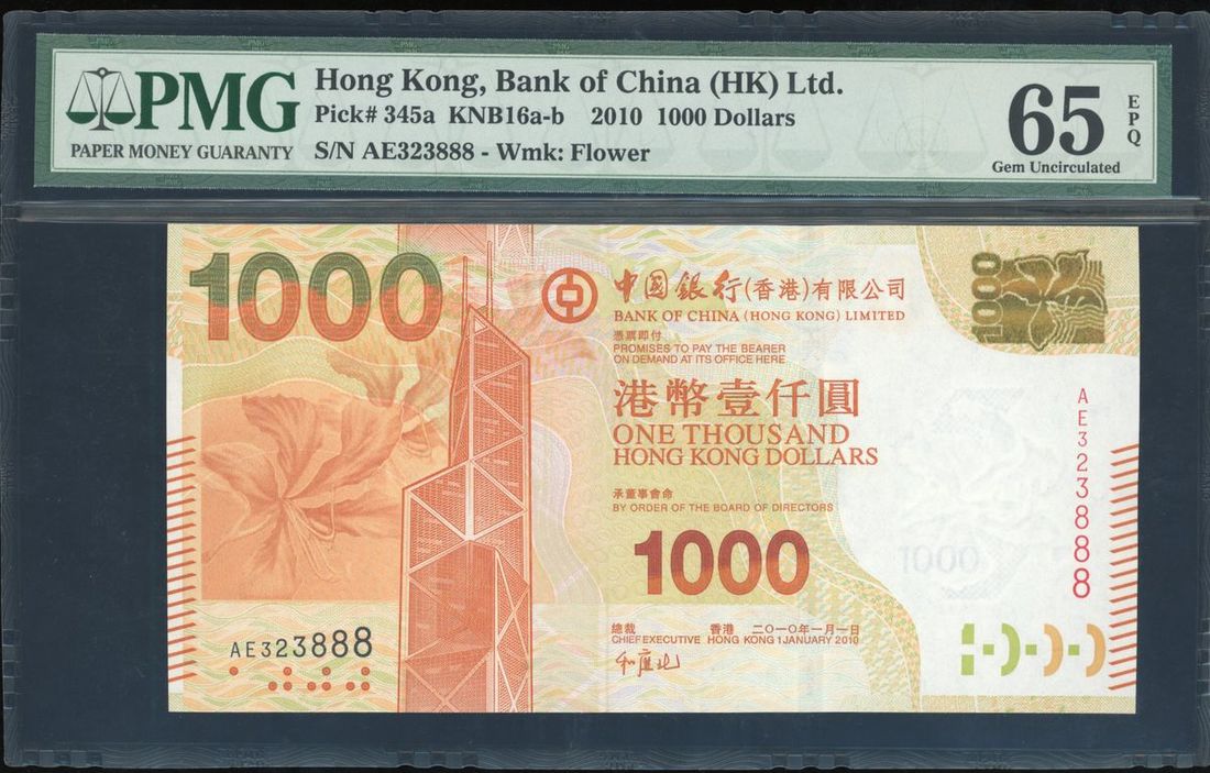 Bank of China, Hong Kong, $1000, 1.1.2010, fancy serial number AE323888, (Pick 345a), PMG 65EPQ Gem Uncirculated.