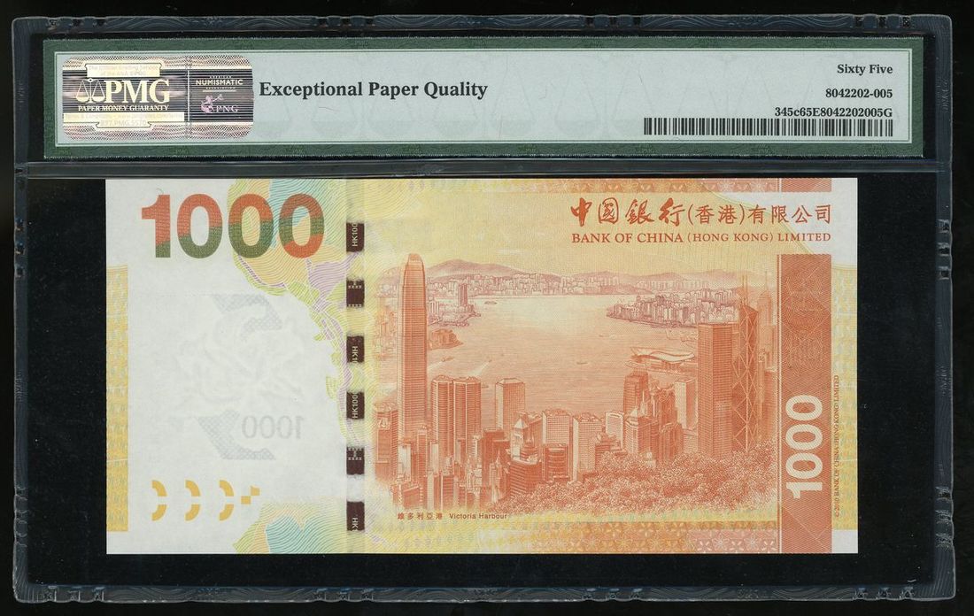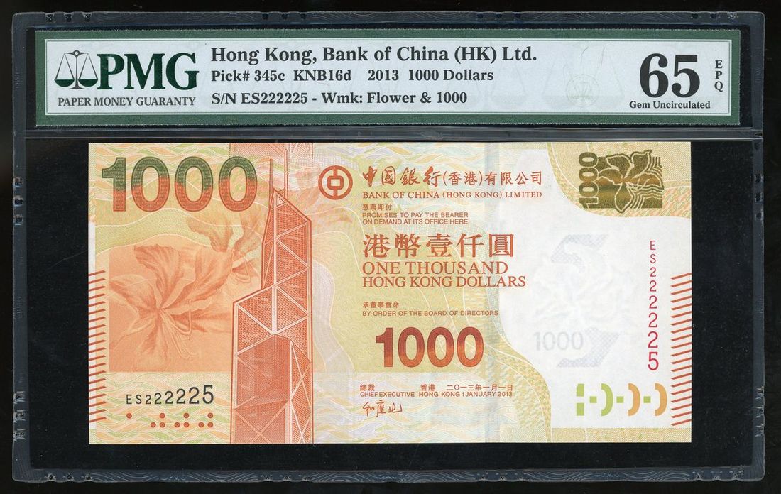 Bank of China, Hong Kong, $1000, 1.1.2013, semi solid serial number ES222225, (Pick 345c), PMG 65EPQ Gem Uncirculated
