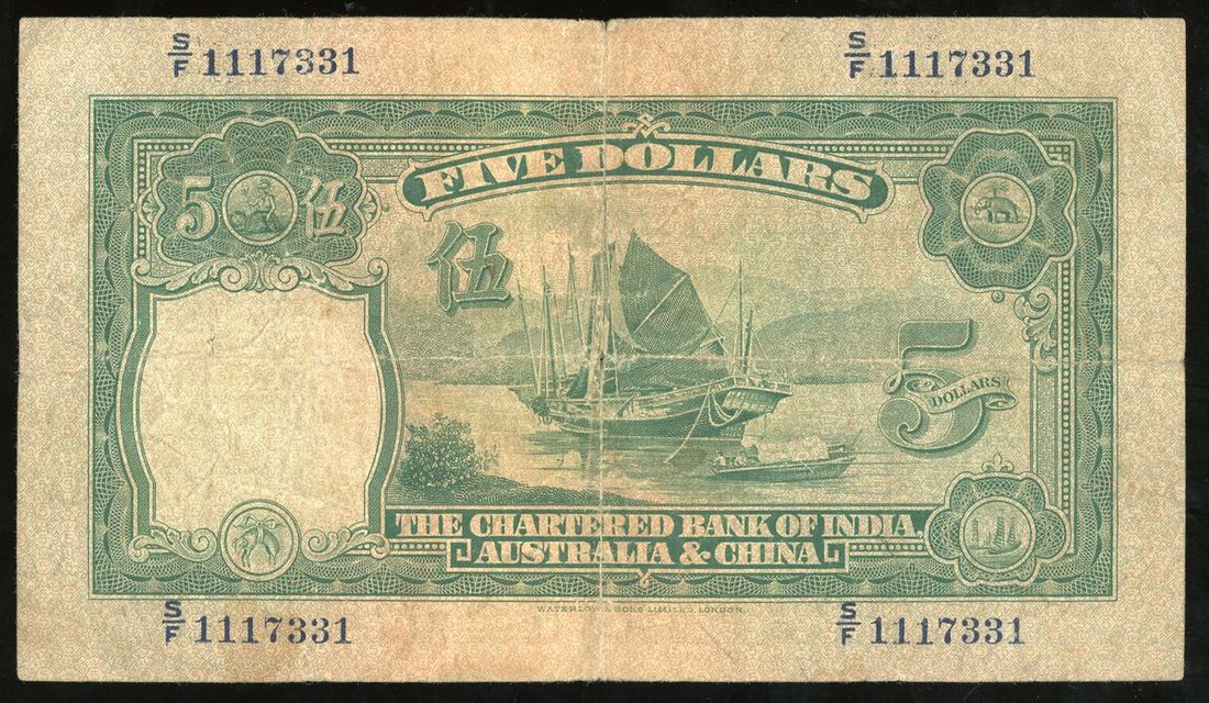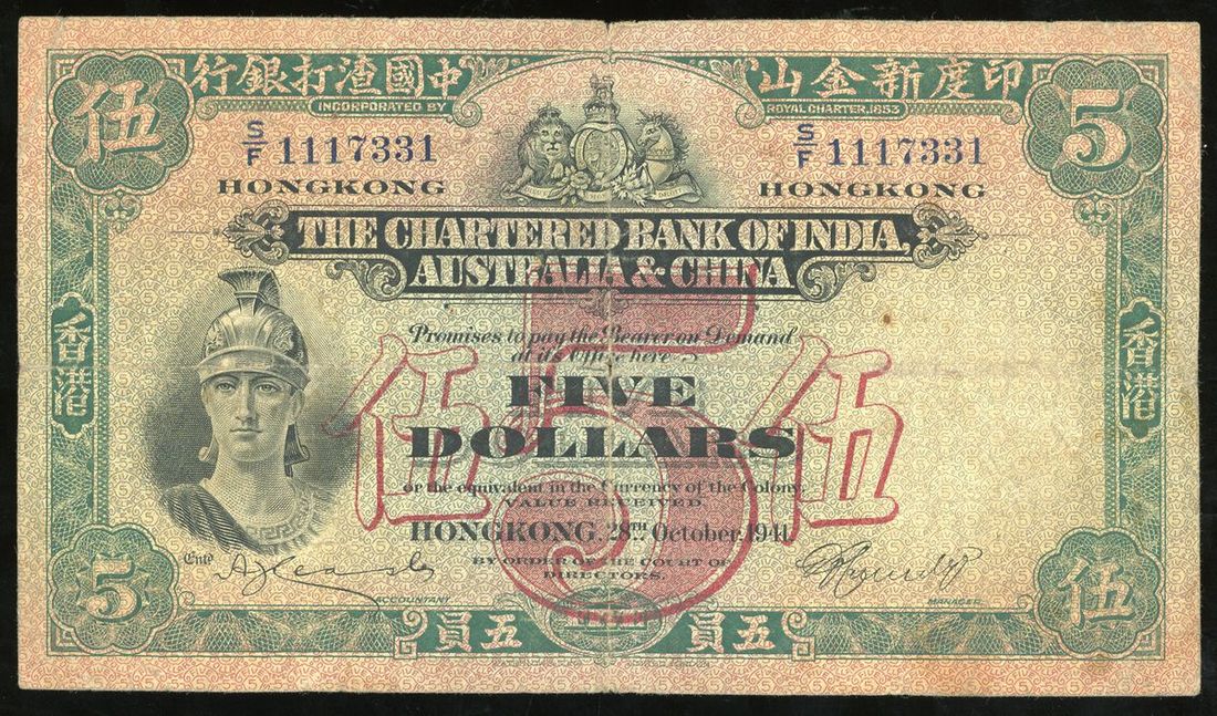 Chatered Bank of India, Australia & China, Hong Kong, $5, 28 October 1941, serial number S/F 1117331, (Pick 54b), fine