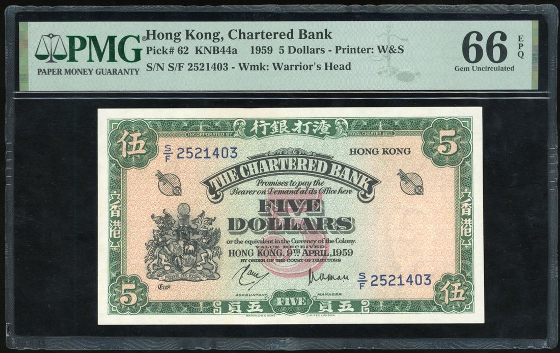 The Chartered Bank, $5, 9.4.1959, serial number S/F2521403, (Pick 62), PMG 66EPQ.