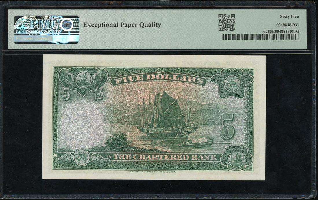 The Chartered Bank, $5, 9.4.1959, serial number S/F2521404, (Pick 62), PMG 65EPQ.