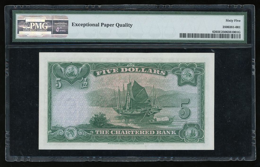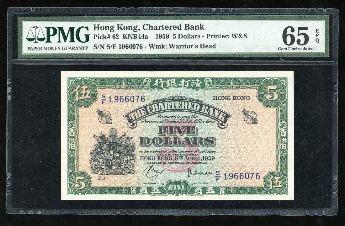 The Chartered Bank, $5, 9.4.1959, serial number S/F1966076, (Pick 62), PMG 65EPQ.