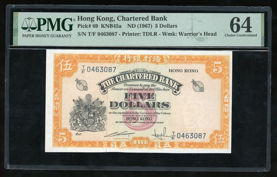 1967年渣打銀行伍員,編號T/F 063087,PMG 64,輕微印刷移位錯體