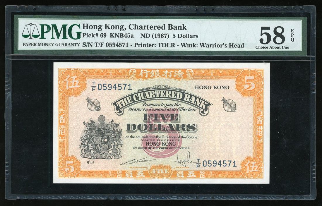 1967年渣打銀行伍員,編號T/F0594571,PMG 58EPQ
