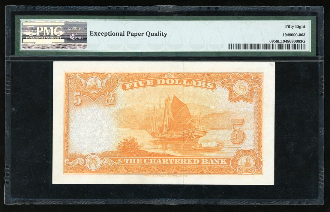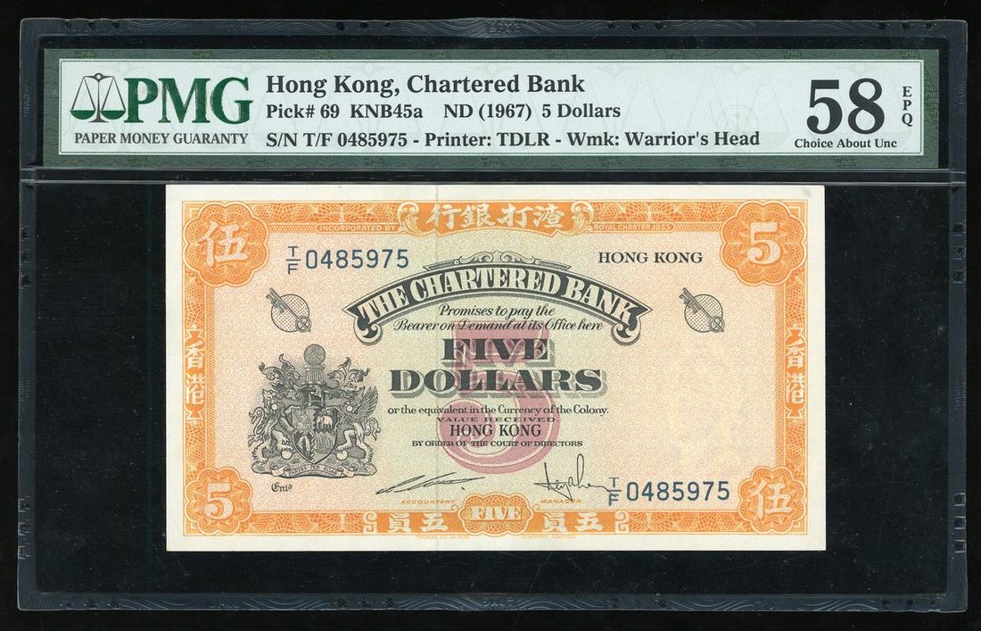 The Chartered Bank, Hong Kong, $5, ND(1967), serial number T/F0485975, (Pick 69), PMG 58EPQ.