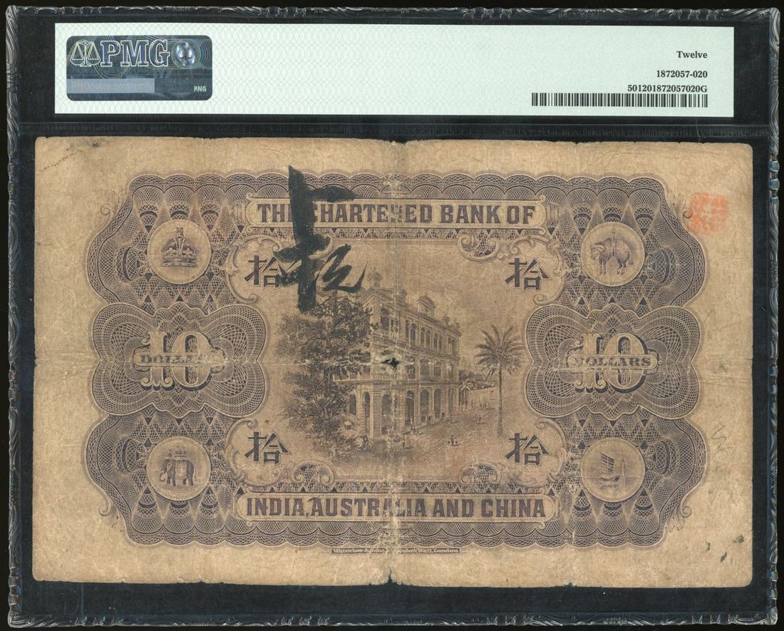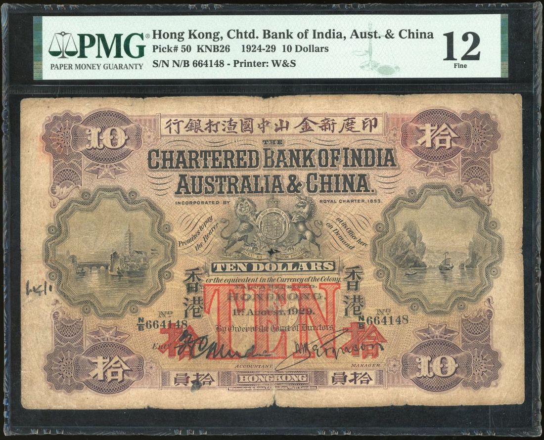 Chartered Bank of India, Australia & China, Hong Kong, $10, 1 August 1929, serial number N/B 664148, (Pick 50), PMG 12 Fine. Though well circulated, still a presentable example for this popular type