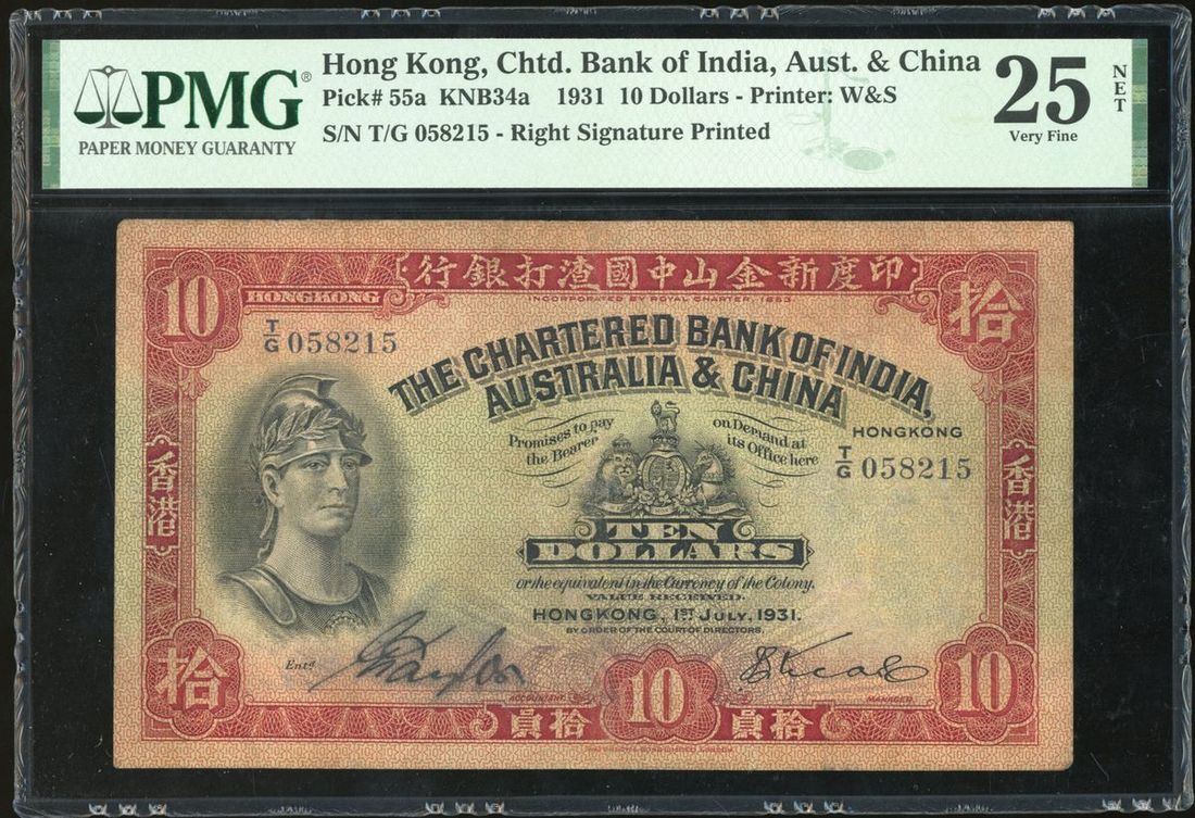 Chartered Bank of India, Australia & China, Hong Kong, $10, 1 July 1931, serial number T/G 058215, one handsigned signature,