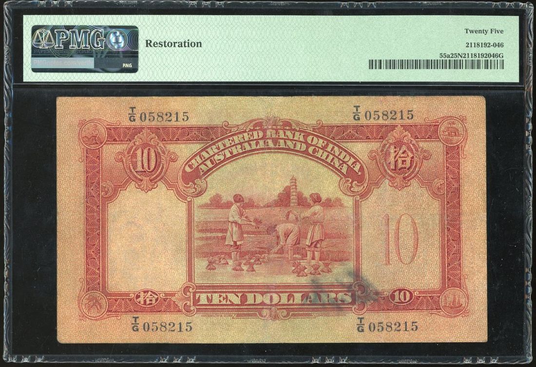 1931年印度新金山中國渣打銀行拾員,編號T/G 058215,左下手簽,PMG 25NET,有修補,首發日期