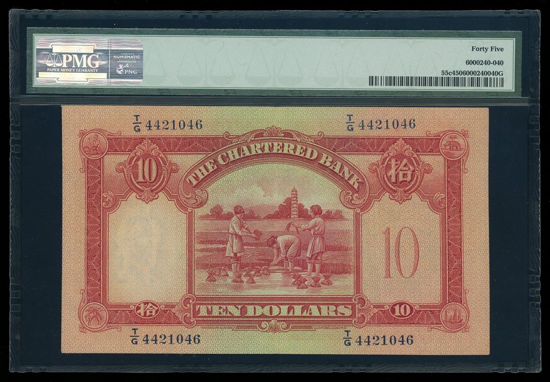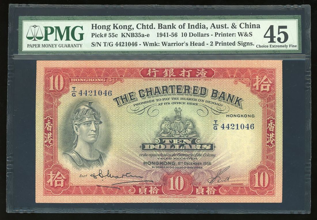 The Chartered Bank, Hong Kong, $10, 6.12.1956, serial number T/G4421046, (Pick 63), PMG 45 Choice Extremely Fine, mislabelled as Pick 55c.