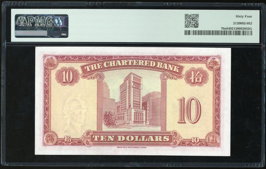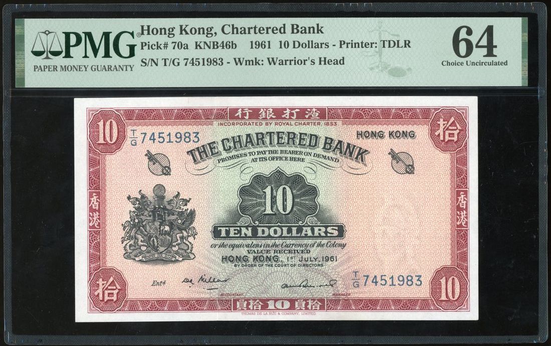 Chartered Bank, Hong Kong, $10. 1 July 1961, serial number T/G 7451983, 'Key Date', (Pick 70a), PMG 64 Choice Uncirculated. High grade example with only 6 better.