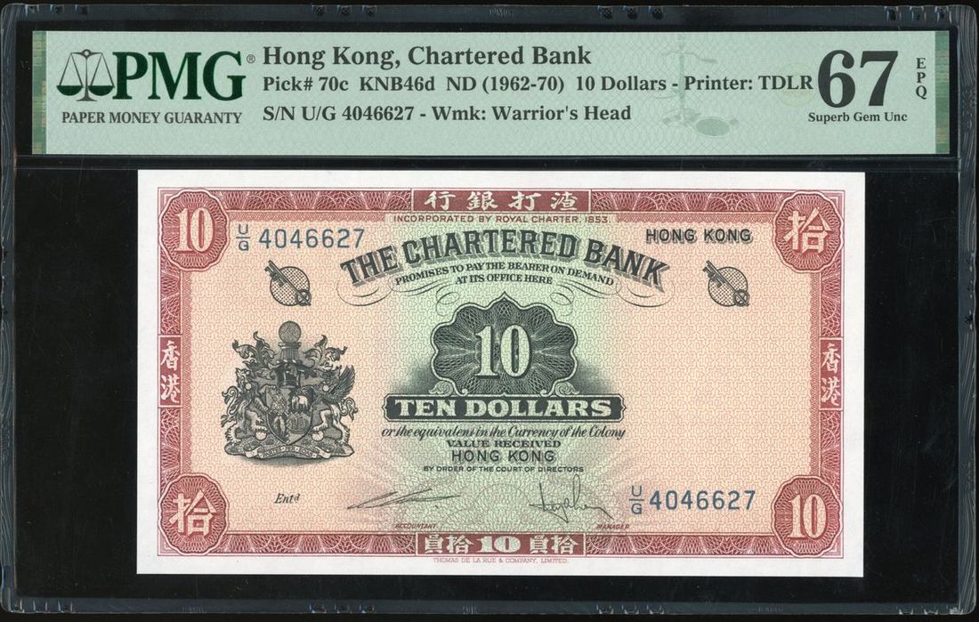 Chartered Bank, Hong Kong, $10, ND (1962-70), serial number U/G 4046627, (Pick 70c), PMG 67EPQ Superb Gem Unc