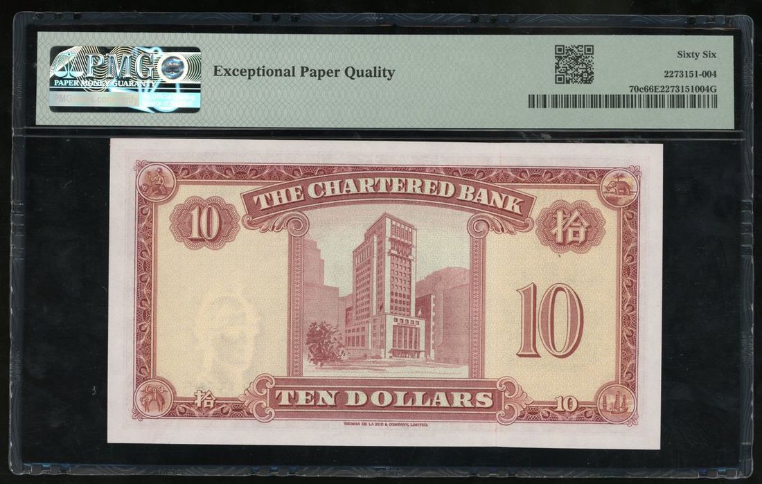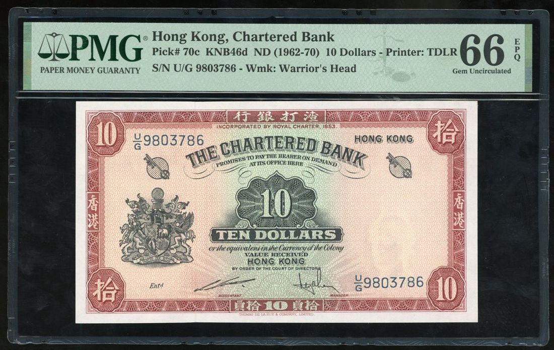 The Chartered Bank, Hong Kong, $10, ND(1962-70), serial number U/G9803786, (Pick 70c), PMG 66EPQ.