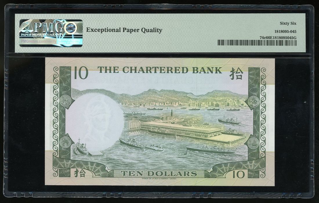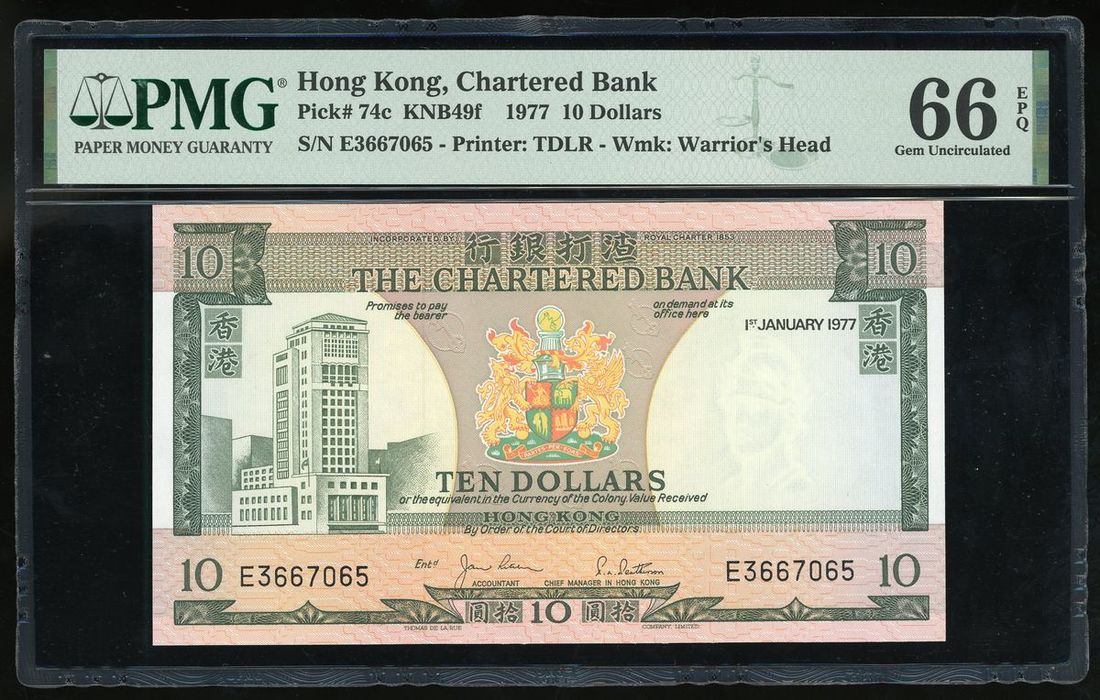 The Chartered Bank, Hong Kong, $10, 1.1.1977, serial number E3667065, (Pick 74c), PMG 66EPQ Gem Uncirculated