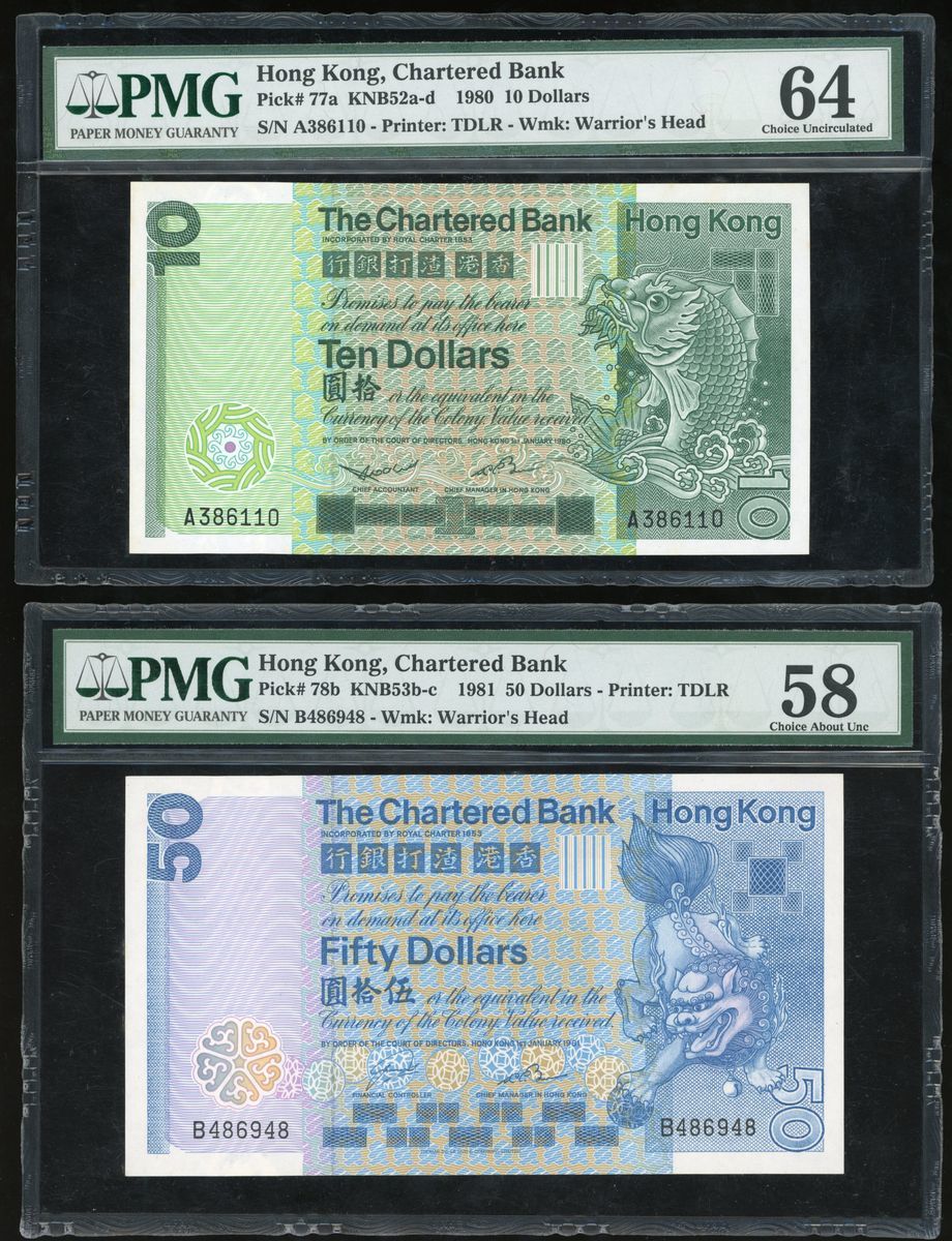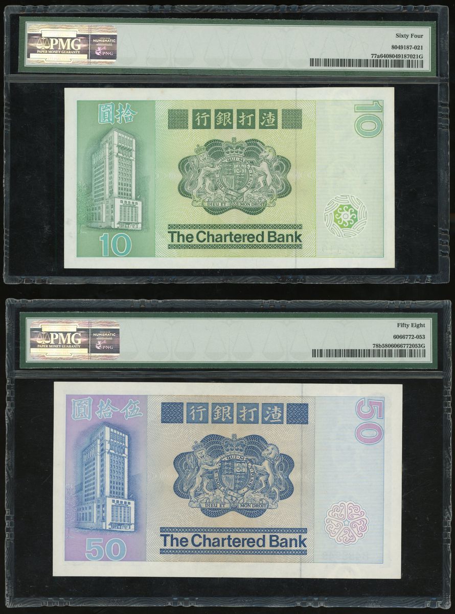 The Chartered Bank, Hong Kong, a pair of $10 and $50, 1.1.1980 and 1.1.1981, serial numbers A386110 and B486948, (Pick 77a and 78b), graded PMG 64 and 58 respectively (2)