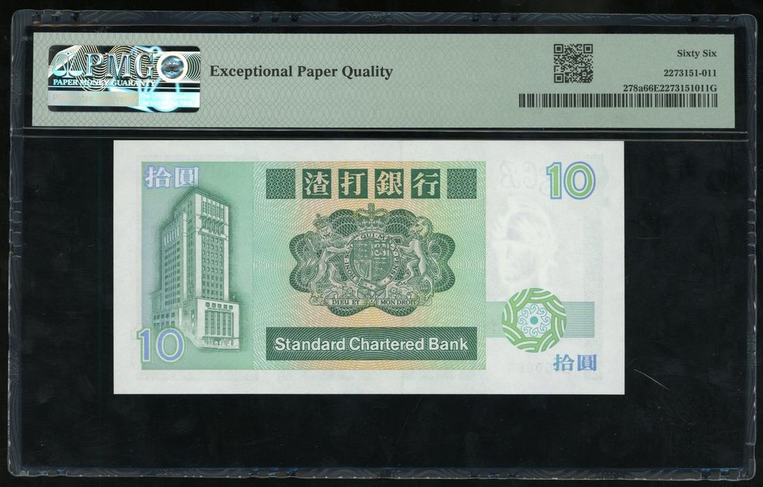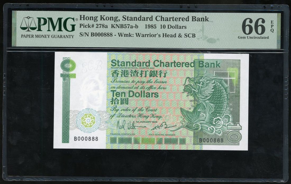 Standard Chartered Bank, Hong Kong, $10, 1.1.1985, semi lucky serial number B000888, (Pick 278a), PMG 66EPQ.