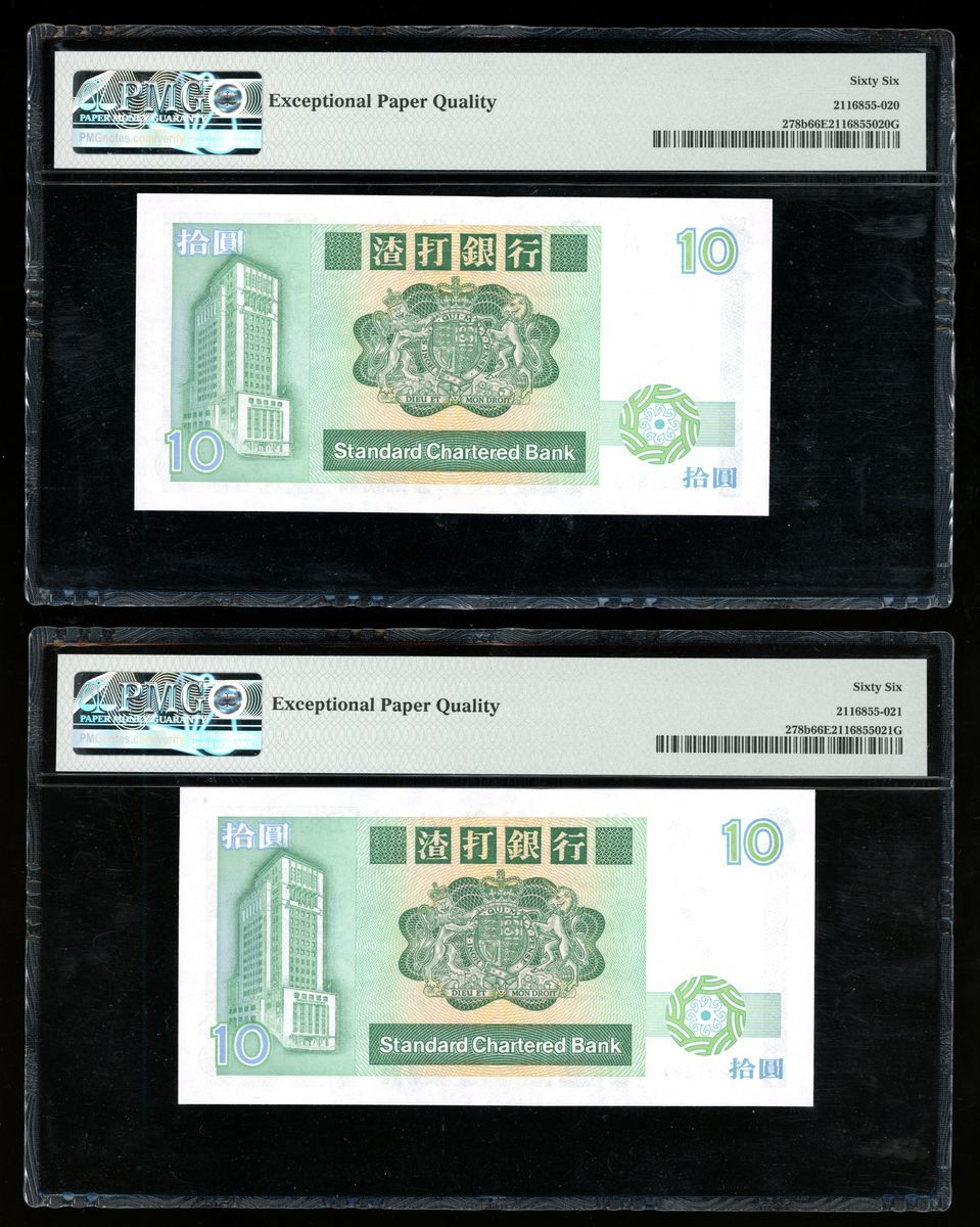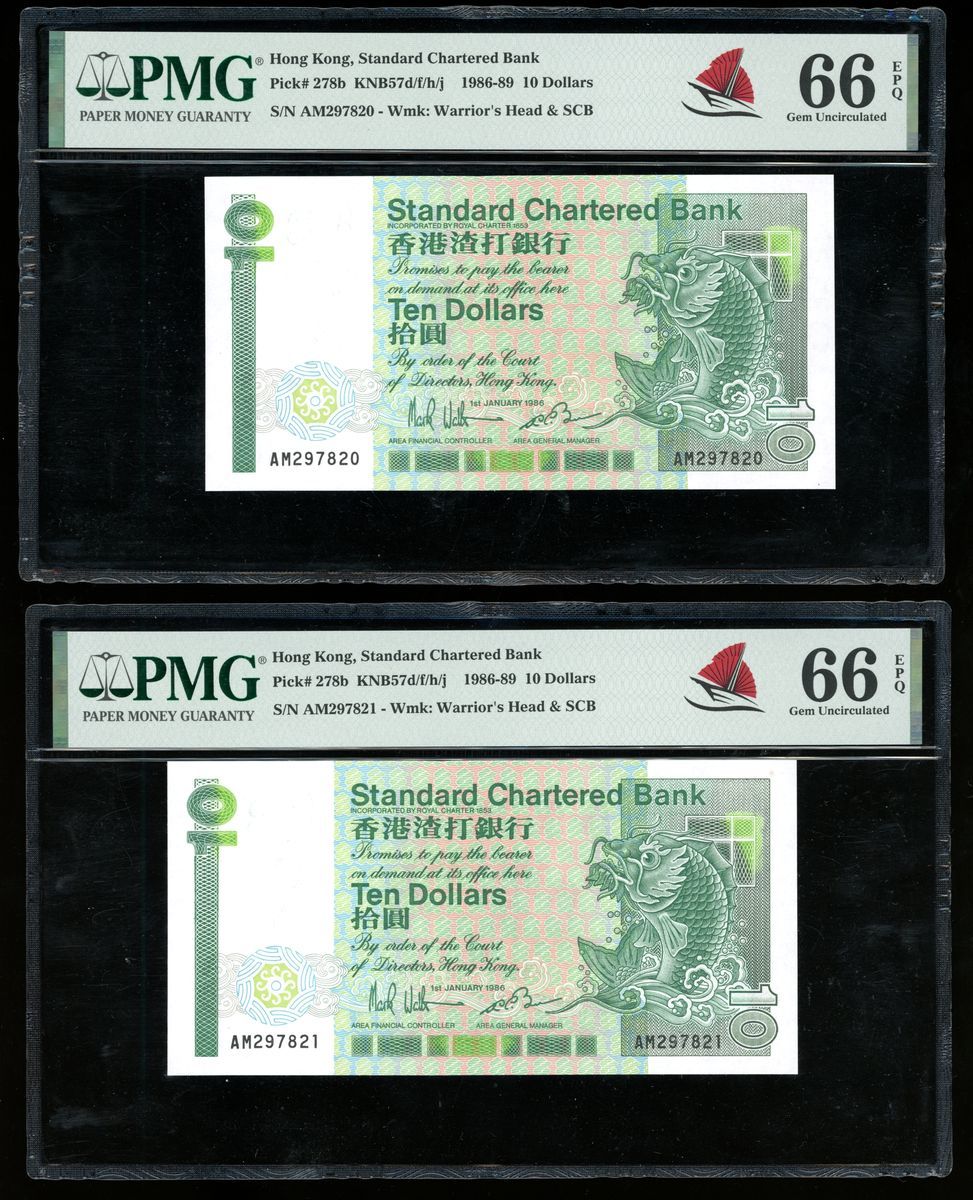 Standard Chartered Bank, Hong Kong, a consecutive pair of $10, 1.1.1986, serial numbers AM297820-21, (Pick 278b), both graded PMG 66EPQ Gem Uncirculated (2).