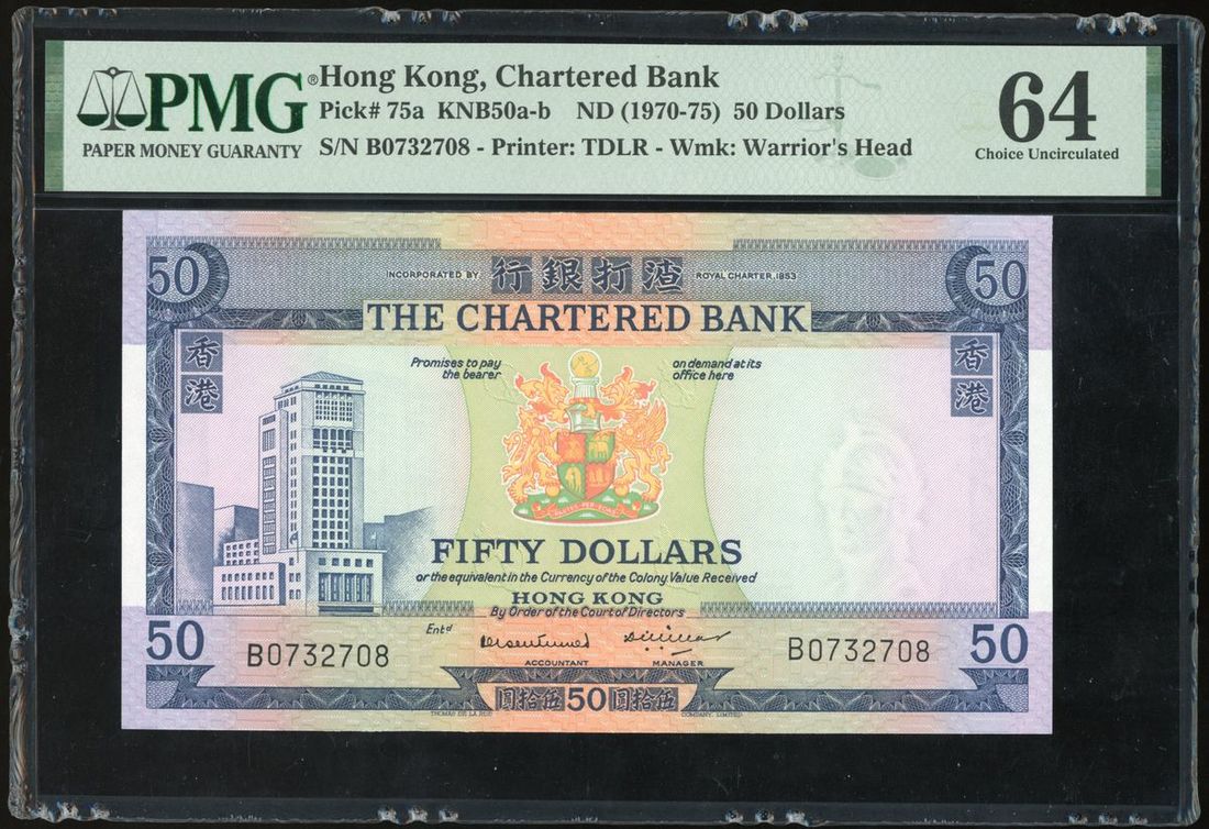 Chartered Bank, Hong Kong, $50, ND (1970-75), serial number B0732708, (Pick 75a), PMG 64 Choice Uncirculated