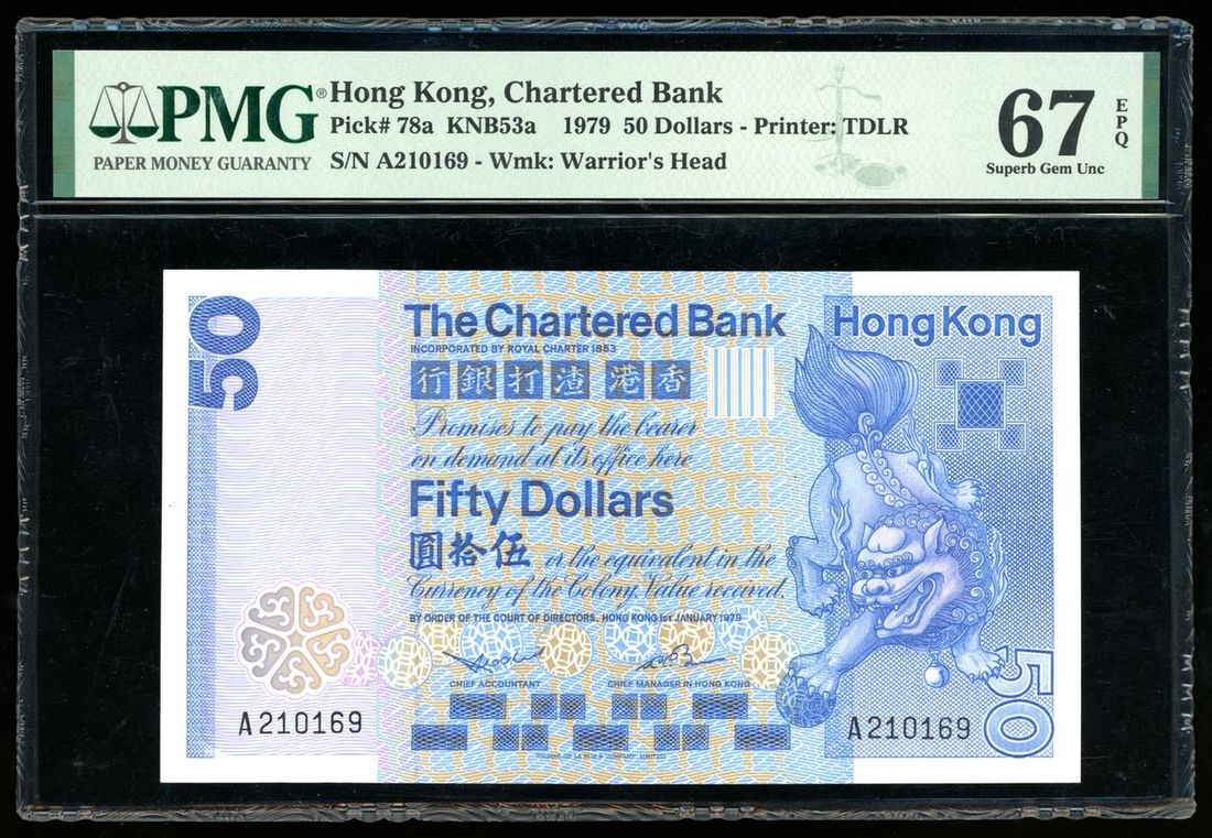The Chartered Bank, Hong Kong, $50, 1.1.1979, serial number A210169, (Pick 78a), PMG 67EPQ Gem Uncirculated.
