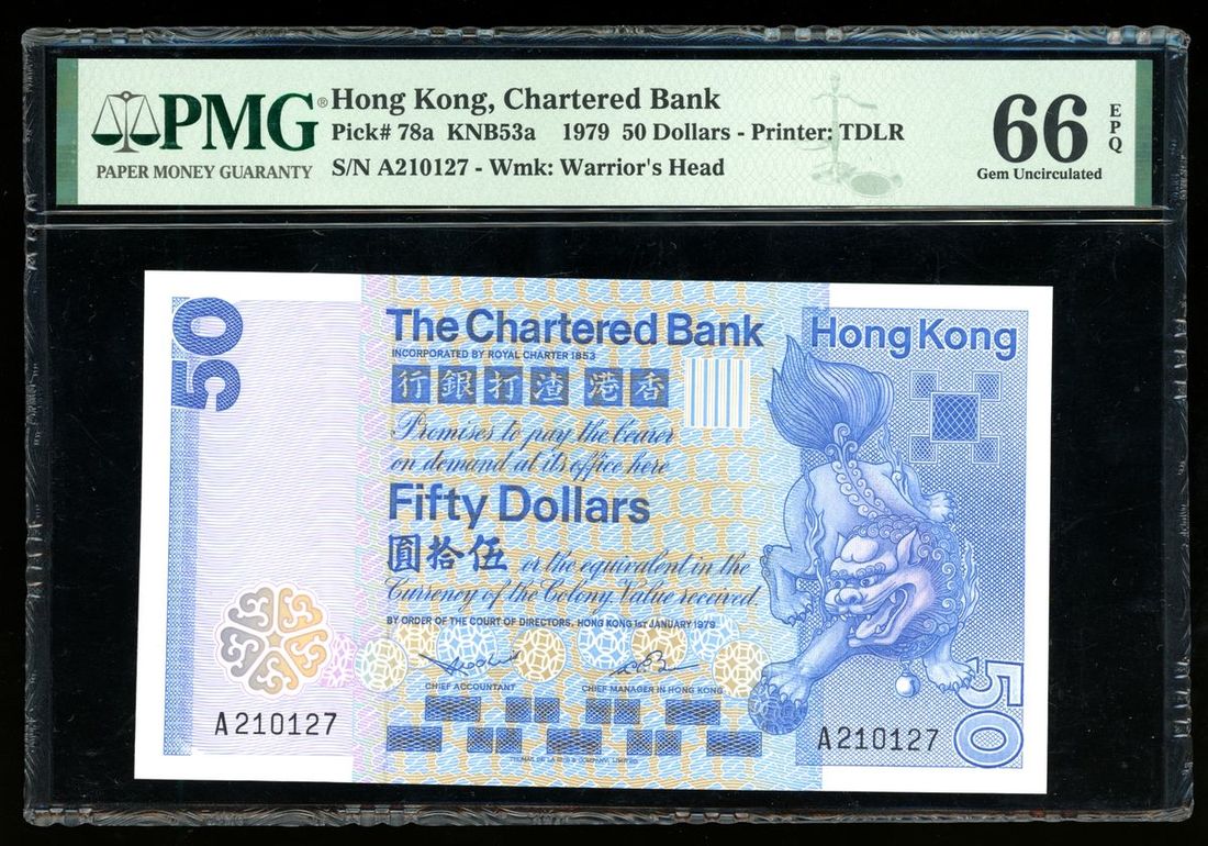 The Chartered Bank, Hong Kong, $50, 1.1.1979, serial number A210127, (Pick 78a), PMG 66EPQ Gem Uncirculated.