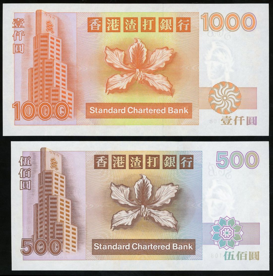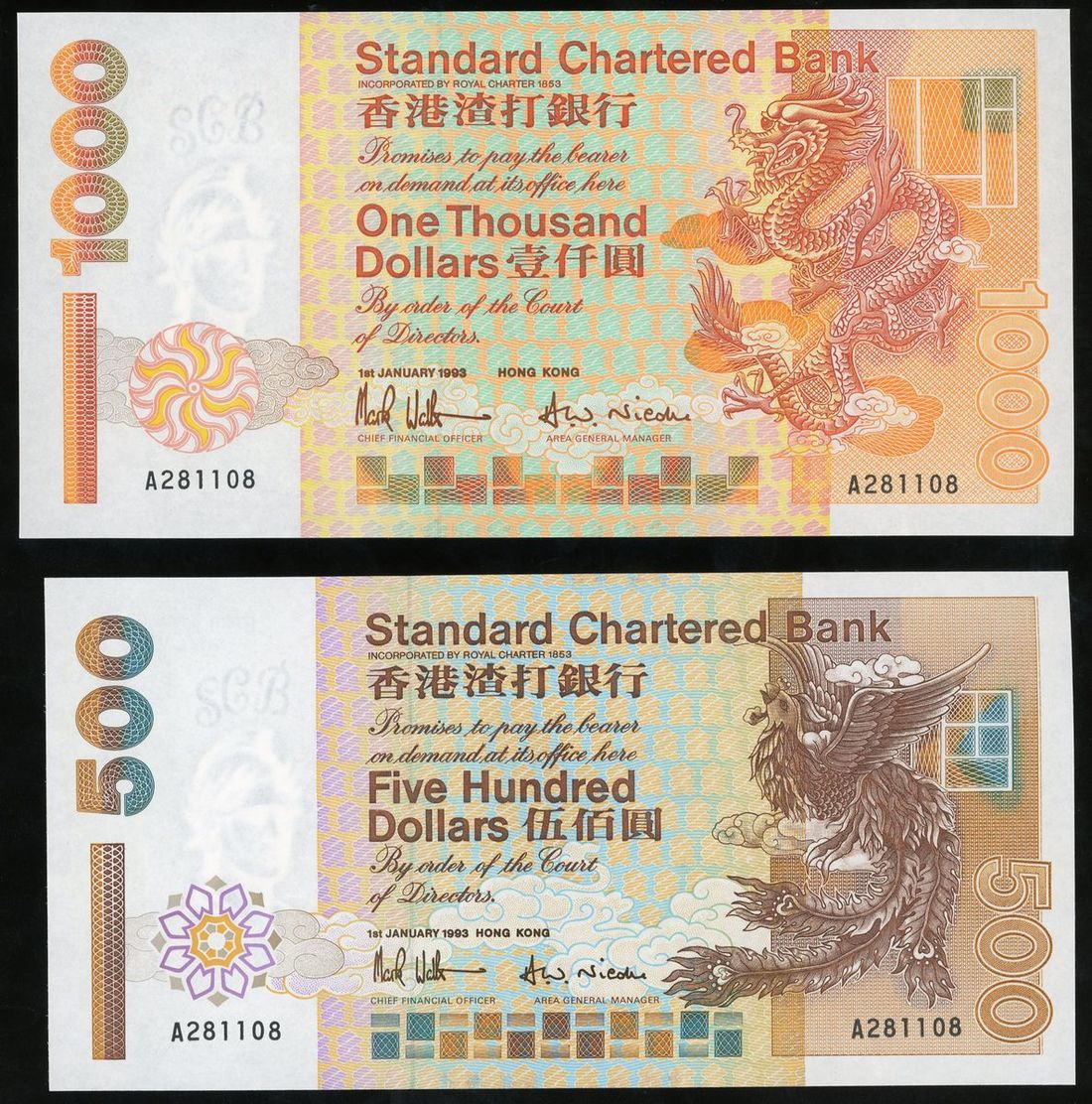 Standard Chartered Bank, Hong Kong, a matching serial number pair, A281108, 1993, including $500 and $1000, (Pick 288a, 289a), uncirculated (2)