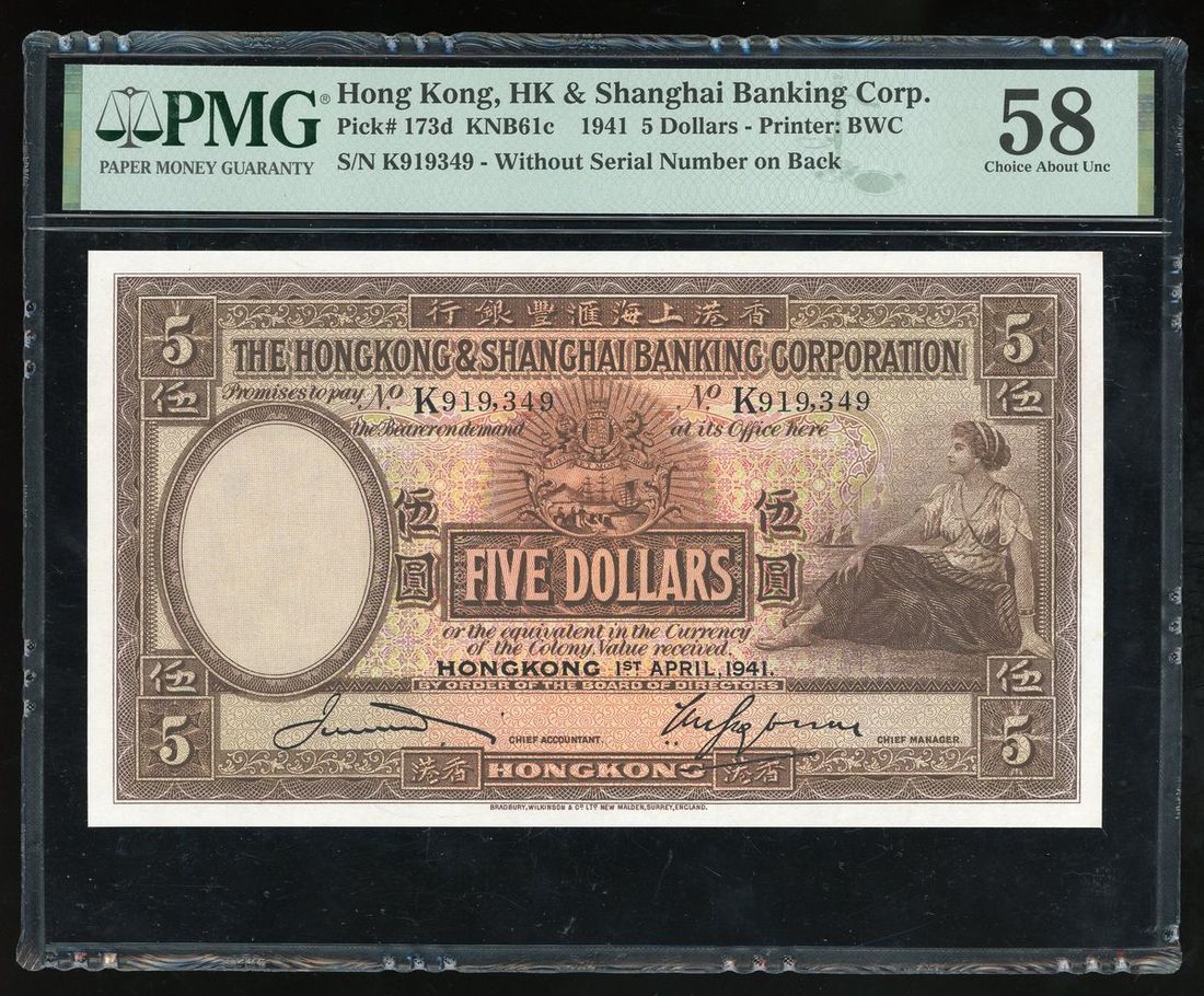The Hongkong & Shanghai Banking Corporation, Hong Kong, $5, 1.4.1941, serial number K919349, (Pick 173d), PMG 58 Choice About Uncirculated