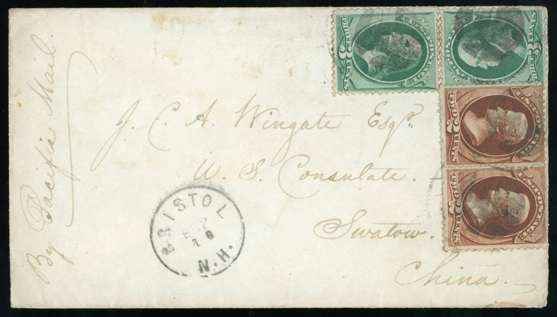 1872年美國寄汕頭實寄封1件,貼美國郵票4枚,郵資合計8分,銷美國9月16日戳,經香港中轉,有香港11月4日戳,及汕頭11月6日英國客郵局到達戳,郵戳清晰,保存完好