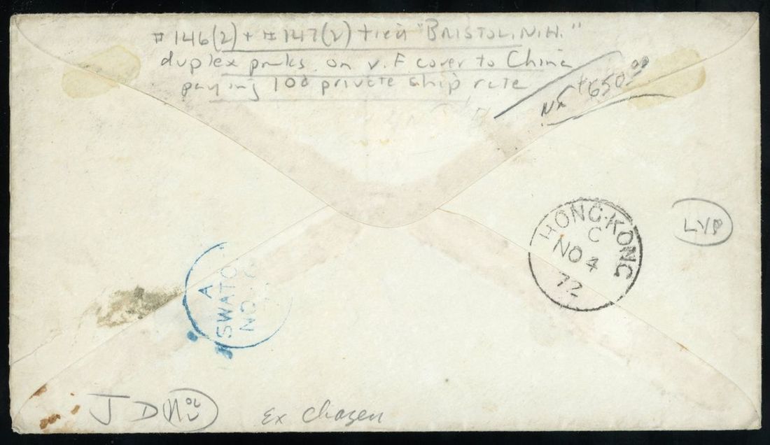 1872 (16 Sep.) incoming cover from U.S.A. to Swatow bearing U.S.A. 2c. (2) and 3c. (2) with strike of cancellation, showing Bristol c.d.s. on front, with Hong Kong transit c.d.s (11.4) and arrival c.d.s. (11.6) on reverse, very fine.