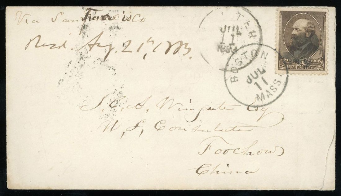 1883年美國波士頓寄福州實寄封1件,貼美國5分票1枚,銷波士頓7月11日戳,經三藩市,香港中轉,有三藩市7月17日戳,香港8月19日戳,及福州21日英國客郵到達戳,郵戳清晰,保存完好