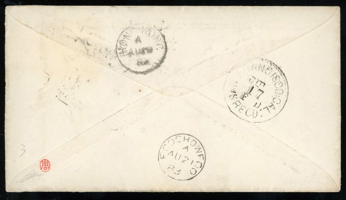 1883 (11 Jul.) incoming envelope to Foochow bearing 5c. tied by Boston duplex via San Francisco (17.7), Hong Kong (19.8) and Foochow (21.8) arrival c.d.s. fine.