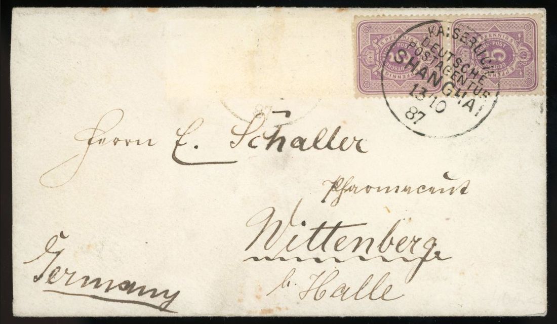 1887 (3 Oct.) envelope to Germany bearing, on the reverse 3ca. tied by Peking seal in blue with Peking customs c.d.s. in blue and Customs Shanghai (8.10) c.d.s. in black, showing Wittenberg (22.11) arrival c.d.s., the address side with German 5pf. pair (another pair missing) tied by German Post in Shanghai (13.10) c.d.s. fine.
