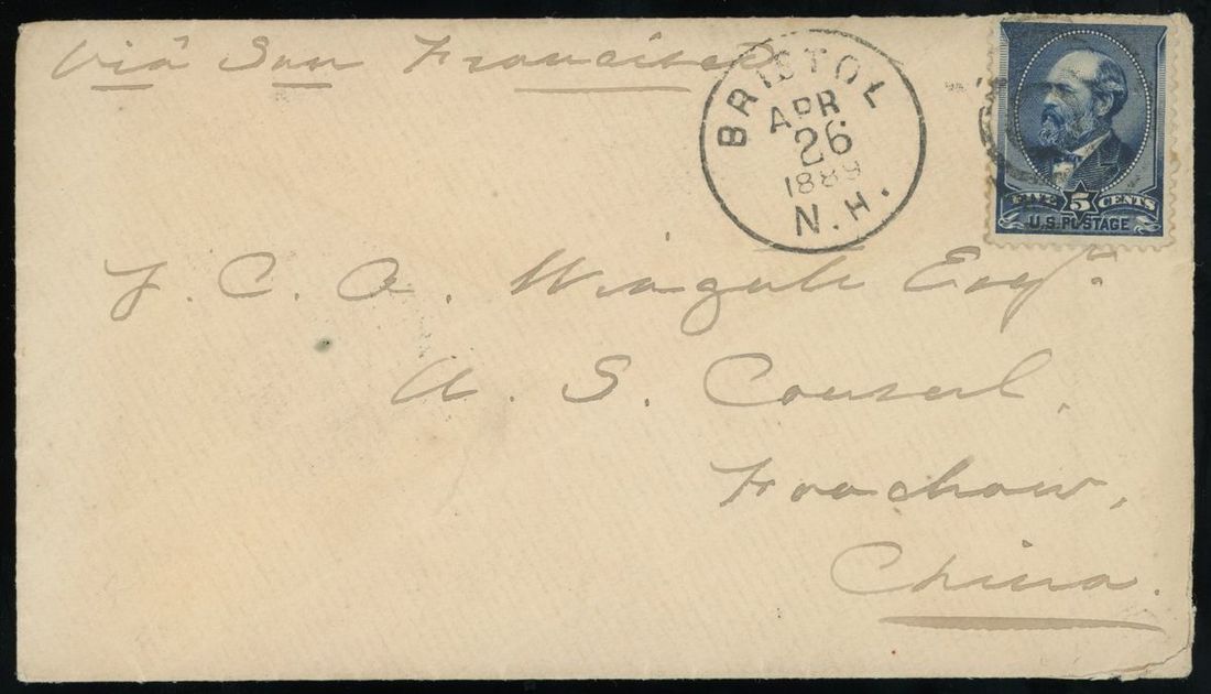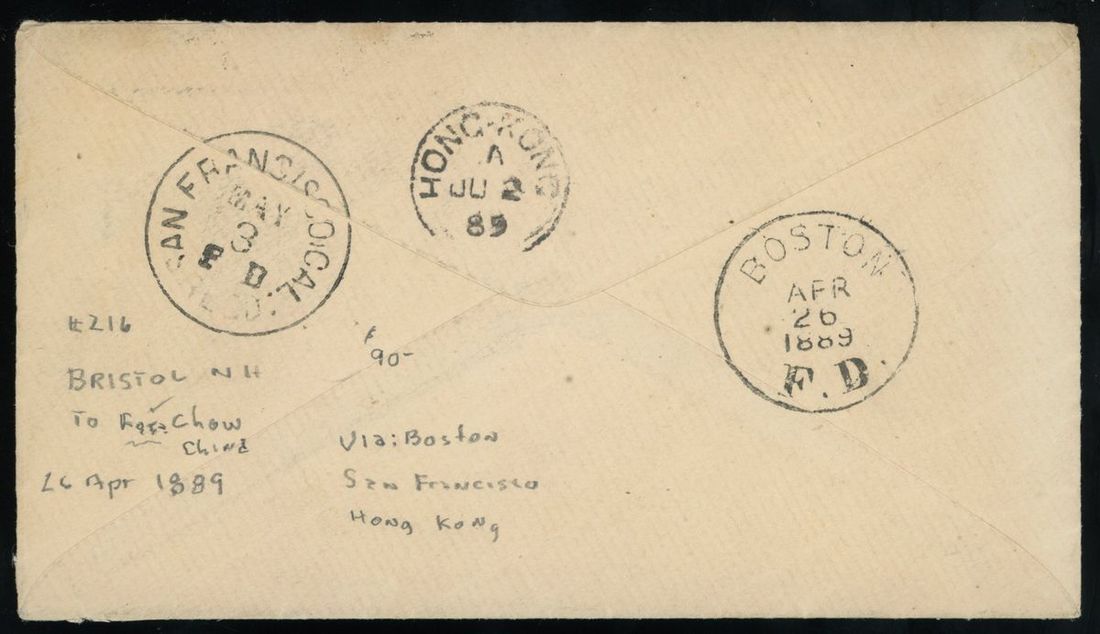 1889 (26 Apr.) incoming cover from U.S.A. to Foochow bearing U.S.A. 5c. with strike of cancellation, "Bristol" c.d.s. alongside, showing on reverse Boston (4.26), San Fransico (5.3) and Hong Kong (6.2) transit c.d.s., very fine.