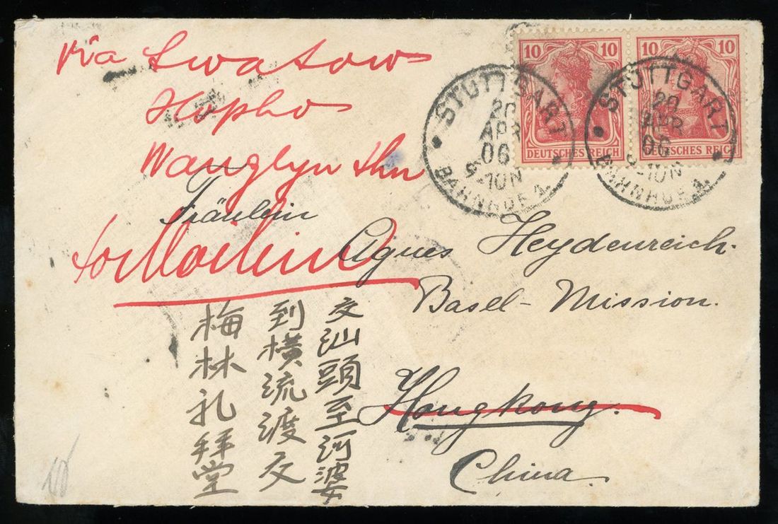 1906 (20 Apr.) incoming German envelope to Hong Kong bearing 10f. tied by Stuttgar c.d.s., redirect to Mailin via Singapore to Hong Kong (12.5), Hong Kong (17.5), Swatow (23.9) and various Chinese c.d.s., very fine.