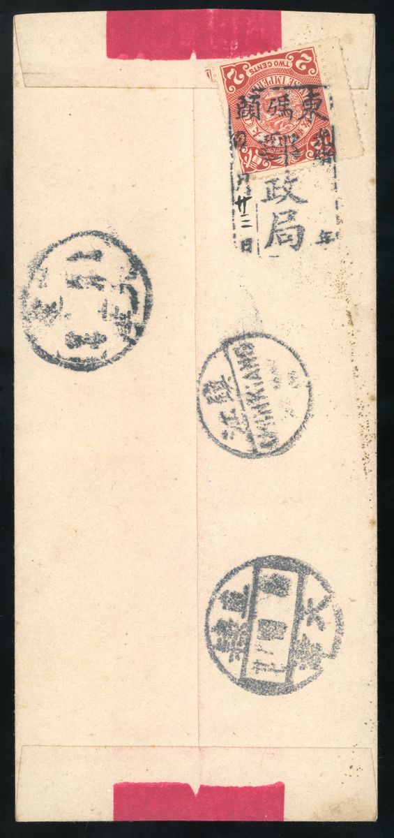 1908年江蘇東碼頭寄天津紅條封1件,貼倫敦版蟠龍2分1枚,銷東碼頭郵政局光緒年日期手填碑型戳,手填日期四月廿三日,經鎮江中轉,有鎮江中轉小圓戳,及直隸天津中文腰框到達戳,保存完好