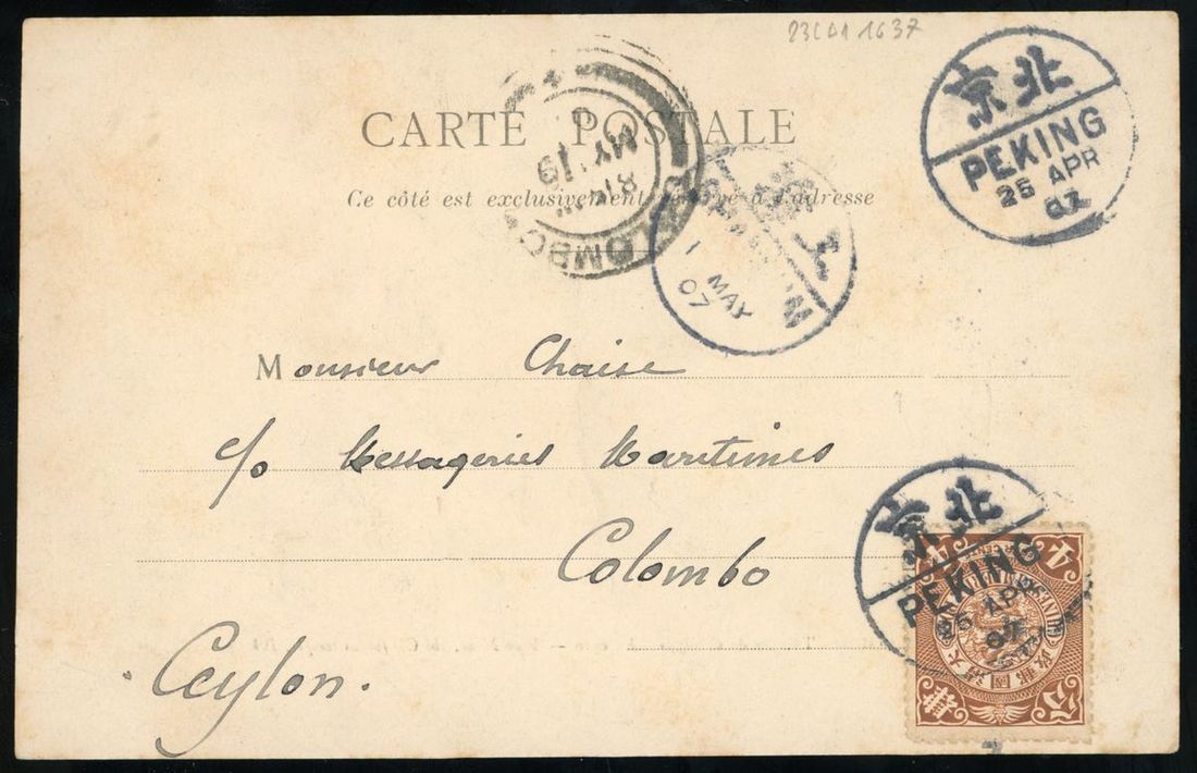 1907年北京寄斯里蘭卡哥倫坡明信片1件,貼倫敦版蟠龍4分1枚,銷北京4月26日戳,經上海中轉,有上海5月1日小圓戳,另有哥倫坡19日到達戳,片背為北京文廟大殿,郵戳清晰,保存完好,清代寄斯里蘭卡郵件少見