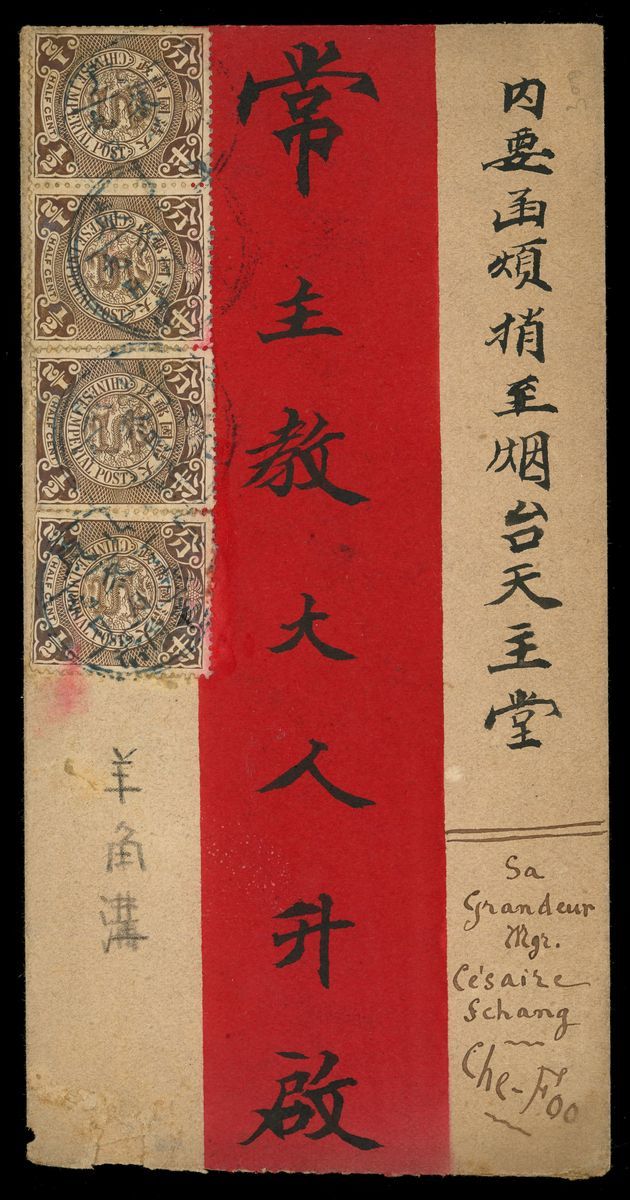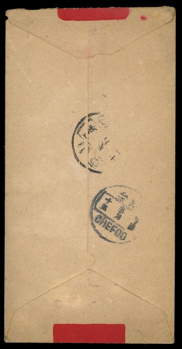 1907 (13 Dec.) red band envelope to Chefoo bearing CIP 1/2c. (4) tied by Yangkiokow lunar c.d.s. in blue, on reverse with Chefoo arrival lunar c.d.s., fine.