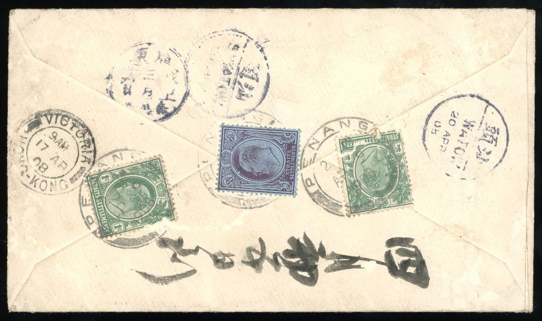 1908 (9 Apr.) incoming envelope to Kiaying bearing Straits Settlement KEVII 1c. (2) and 8c. tied by Penang c.d.s., via Hong Kong (17.4), Swatow (20.4) and Kiaying (24.4), very fine.