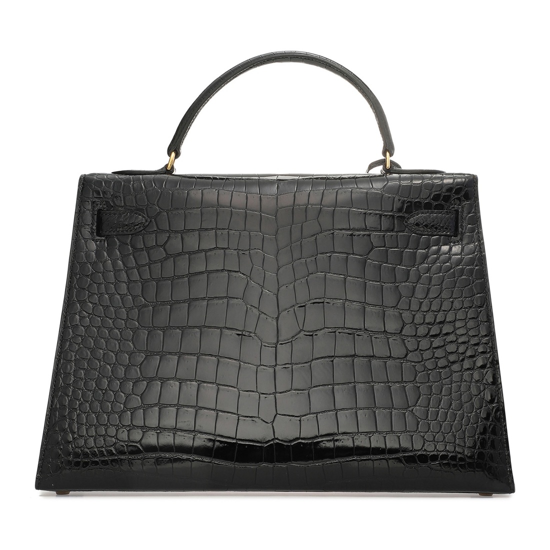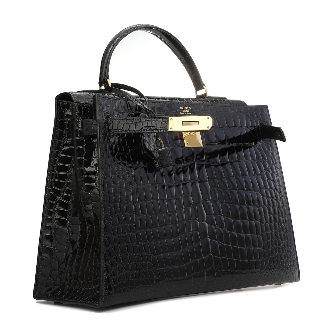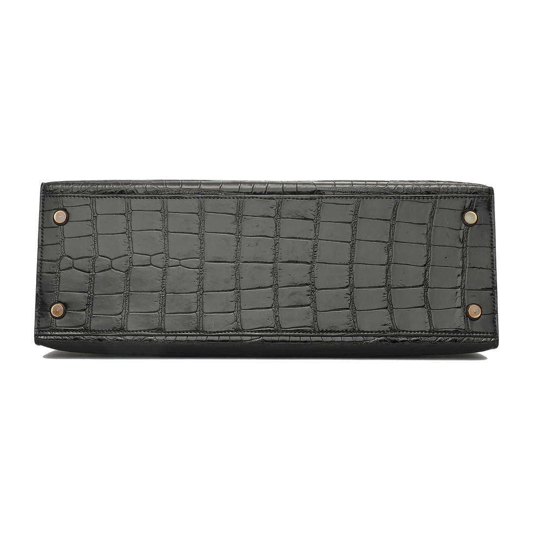 BEAUTIFUL VINTAGE BLACK SHINY ALLIGATOR KELLY SELLIER 32 WITH GOLD HARDWARE
