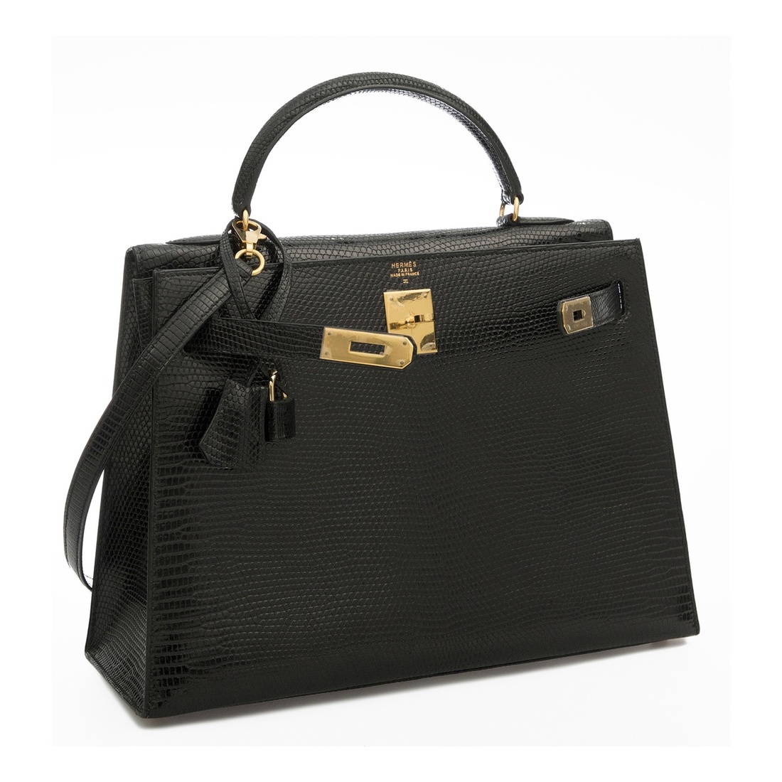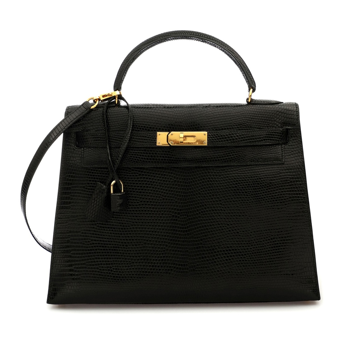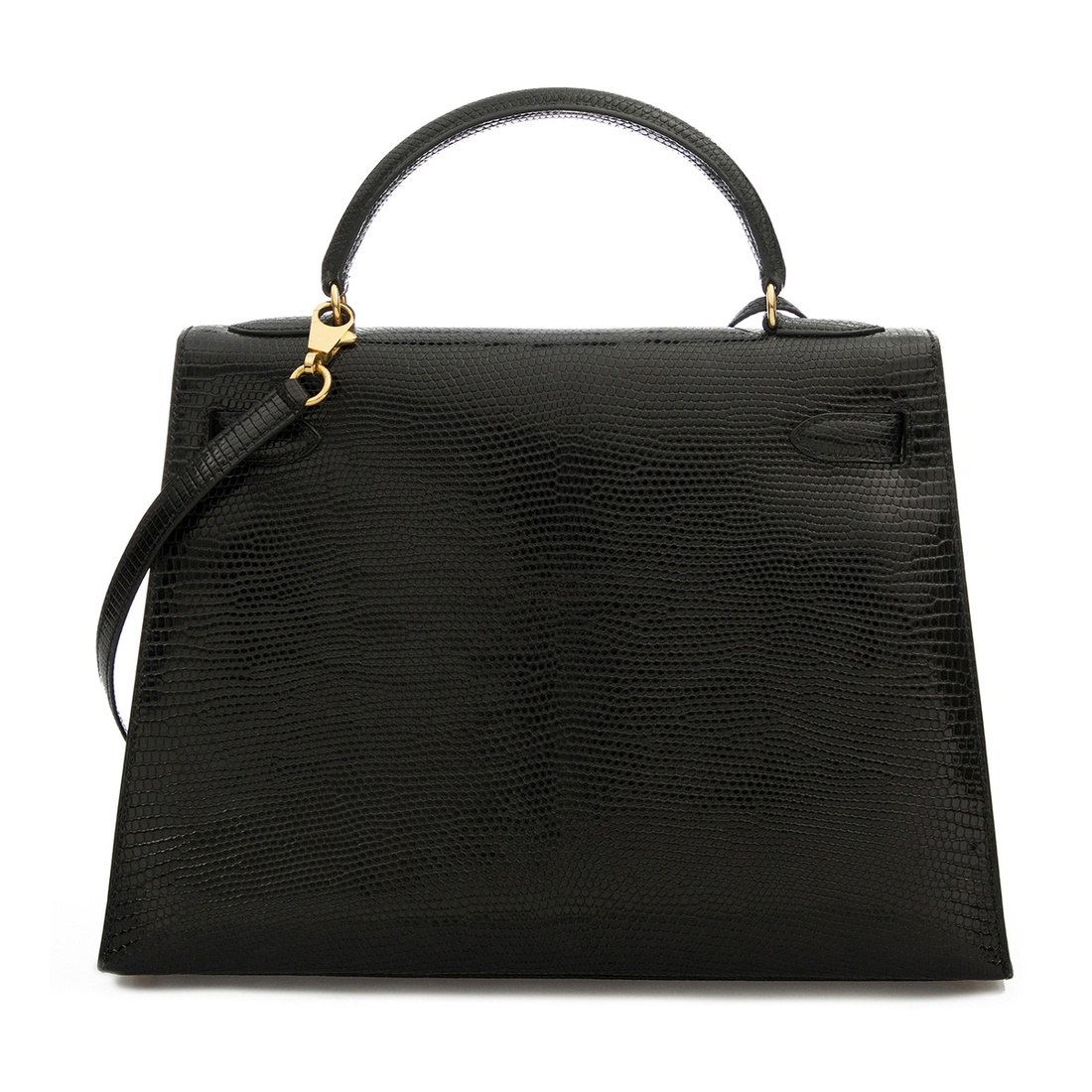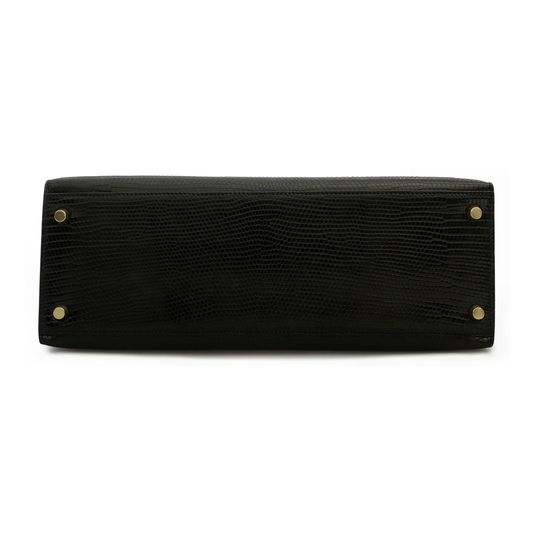 A BLACK SALVATOR LIZARD KELLY 32 WITH GOLD HARWARE