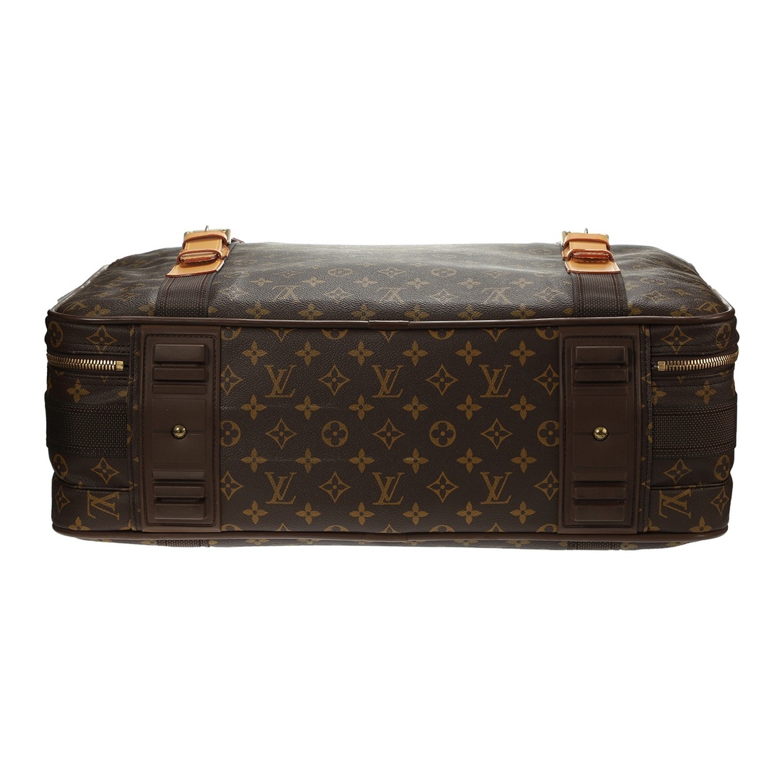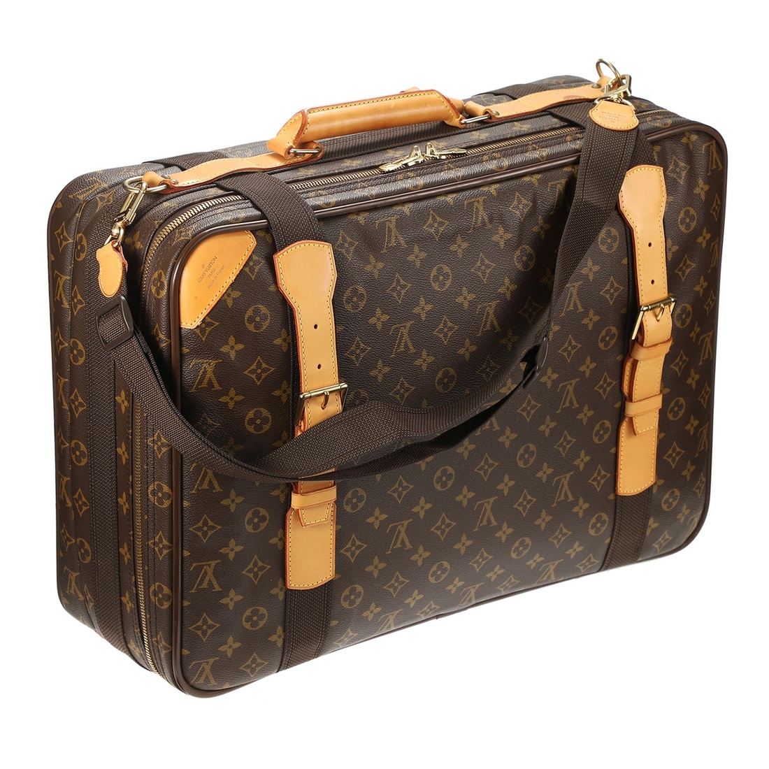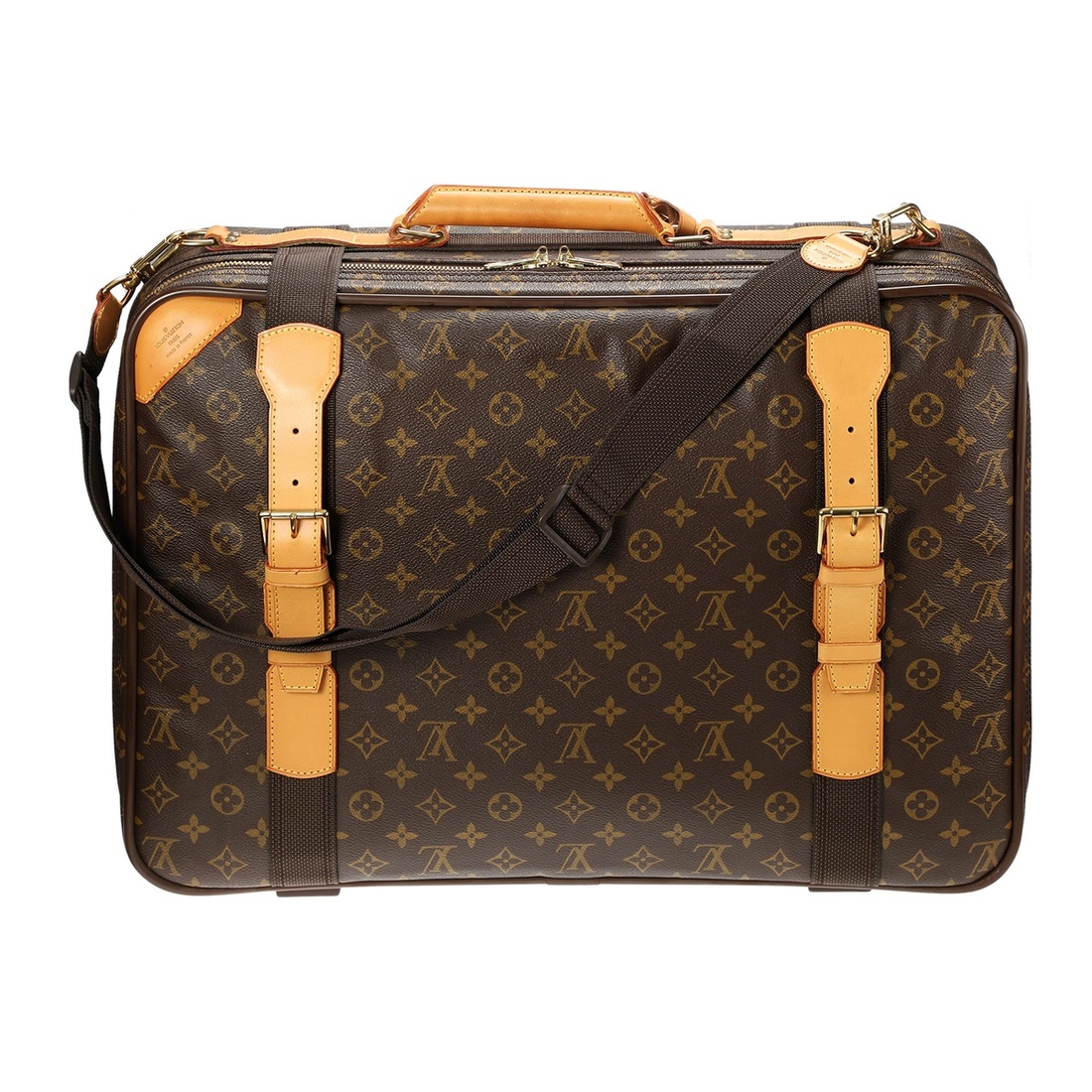 A BROWN MONOGRAM CANVAS SATELLITE 50 SOFT SUITCASE WITH GOLDEN BRASS HARDWARE