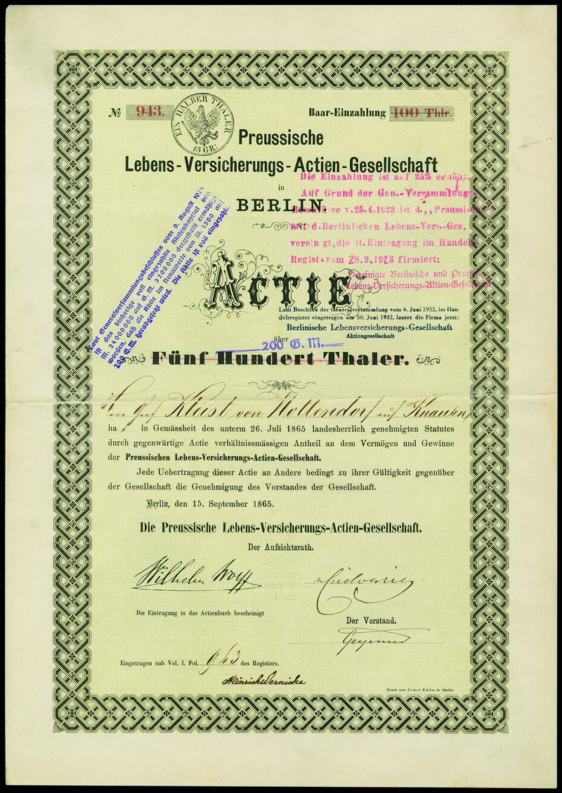 Preussische Lebens-Versicherungs-AG. Namenaktie über 500 Thaler. Berlin, 15. September 1865. Grün. Nr. 943. Nicht entwertetes Gründerstück. Es wurden 2.000 Aktien zu je 500 Taler begeben. 1923 erfolgte die Vereinigung mit der Berlinischen Lebensversicherungs-Aktien-Gesellschaft unter Umfirmierung in Vereinigte Berlinische und Preussische Lebens-Versicherungs-Aktien-Gesellschaft. Dannach wechselte der Name in Berlinische Lebensversicherungs-Gesellschaft Aktiengesellschaft. Originalunterschriften des Aufsichtsrates und des Vorstandes, innenseitige Übertragungsvermerke mit Originalunterschriften. VF.