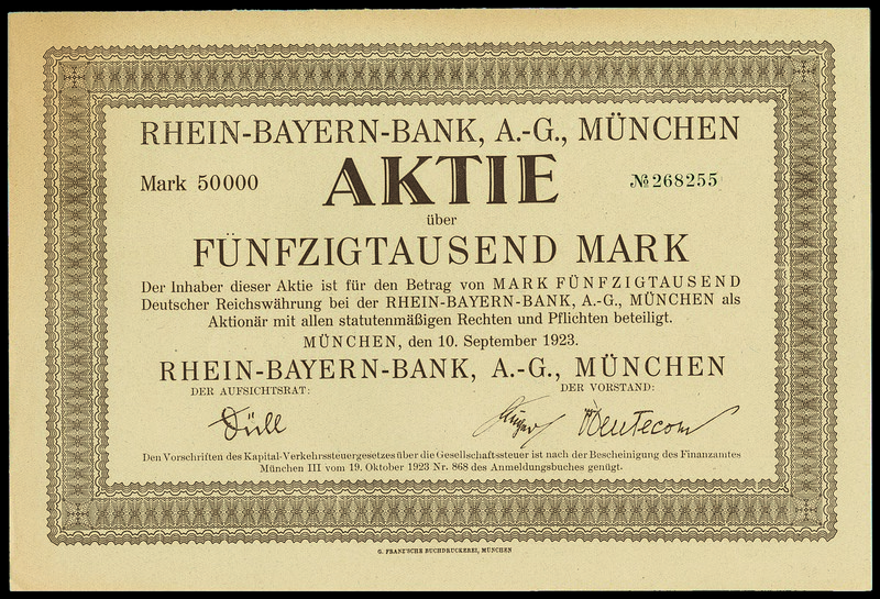 Rhein-Bayern-Bank AG. Aktie über 50.000 Mark. München, 10. September 1923. Braun. Nr. 268255. Gründung 1923 zum Betrieb von Bank- und Handelsgeschäften. Das Institut trat jedoch schon 1924 in Liquidation. Hoher Nominalwert. Unentwerteter Titel. EF.