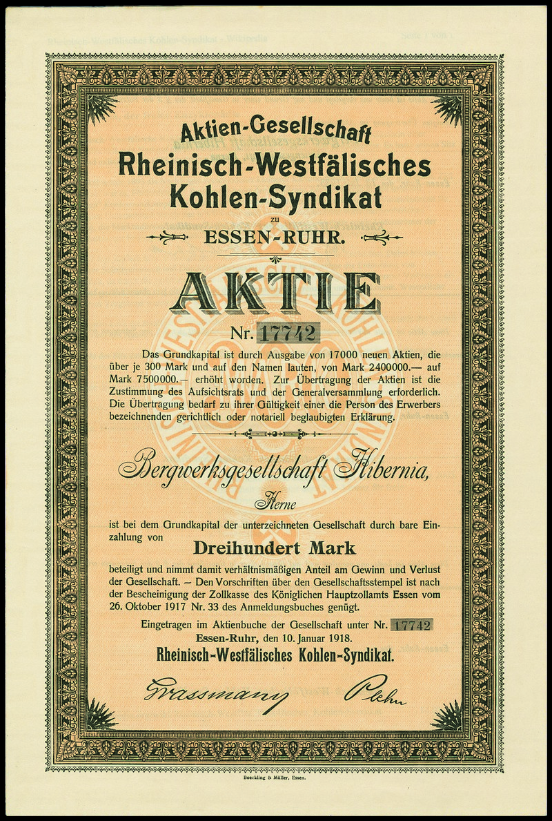 Rheinisch-Westfälisches Kohlensyndikat. Aktie über 300 Mark. Essen-Ruhr, 10. Januar 1918. Braun. Nr. 17742. Als Vertriebs-Kartell im Jahre 1893 gegründet. 1945 wurde das Kartell durch die Besatzungsmächte aufgelöst. Ausgestellt auf die Bergwerks-Gesellschaft Hibernia Herne. UNC.