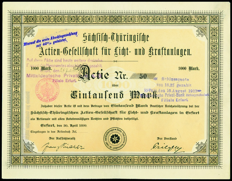 Sächsisch-Thüringische Actien-Gesellschaft für Licht- und Kraftanlagen. Aktie über 1.000 Mark. Erfurt, 30. April 1899. Gelbbraun. Nr. 50. Das Unternehmen errichtete die Gasanstalt in Frankenhausen am Kyffhäuser. Da diese 1909 an die Stadt Frankenhausen verkauft wurde, trat die Firma ab 1910 in Liquidation. VF.