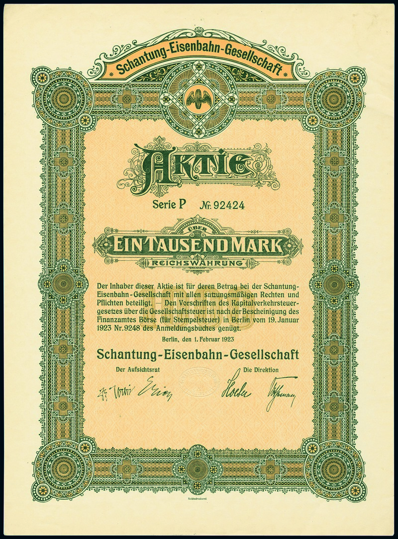 Schantung-Eisenbahn-Gesellschaft. Aktie über 1.000 Reichsmark. Berlin, 1. Februar 1923. Orange/grün. Unentwertet. Nr. 92424. 1899 als Deutsch-Chinesische AG gegründet. Erste deutsche Bahnlinie in China (erste Teilstrecke 1901 fertiggestellt). 1923 erfolgte die Sitzverlegung nach Berlin. Die Schantung-Eisenbahn erschloss die wertvollsten Kohlengebiete Chinas und diente dem Truppentransport von der deutschen Kolonie Kiautschou ins Landesinnere. Der Bau der Schantung-Eisenbahn war Mitauslöser der Bauernaufstände (1899-1900), die später als Boxer-Aufstand in die Geschichte einging. EF.