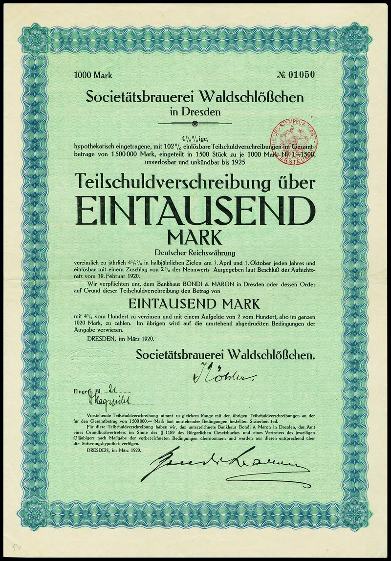 Societätsbrauerei Waldschlösschen in Dresden. Teilschuldverschreibung über 1.000 Mark. Dresden, im März 1920. Blau. Nr. 1050. Die Gesellschaft entstand 1836 als “Gesellschaft zur Herstellung von Bier”. Sie nannte sich “Societätsbrauerei Waldschlösschen zu Dresden” und exportierte unter diesem Namen schon 1855 Bier nach Brasilien. Unentwerteter Titel. EF.