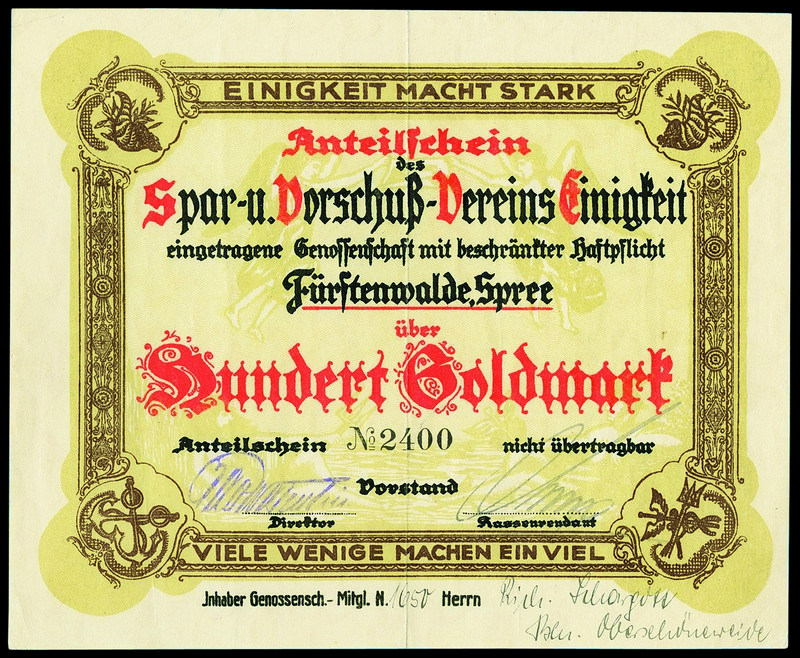 Spar- u. Vorschuss-Vereins Einigkeit. Anteilschein über 100 Goldmark. Fürstenwalde, Spree, undatiert. Braun/rot. Nr. 2400. Sehr dekorative Titel mit Füllhörner, Anker, Dreizack und Hermesstab in der Umrandung, im Unterdruck Engel mit Neptun und Hermes am Flussufer. Unentwerteter Titel. Nicht im BARoV. VF.