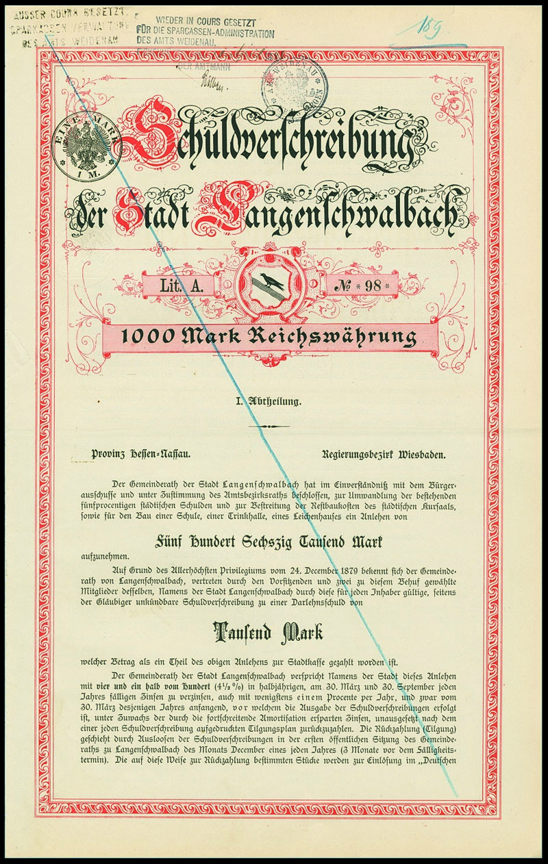 Stadt Langenschwalbach. 4½%-Schuldverschreibung 1.000 Mark, Langenschwalbach, 1. März 1880. Nr. A 98. Riss repariert. VF.